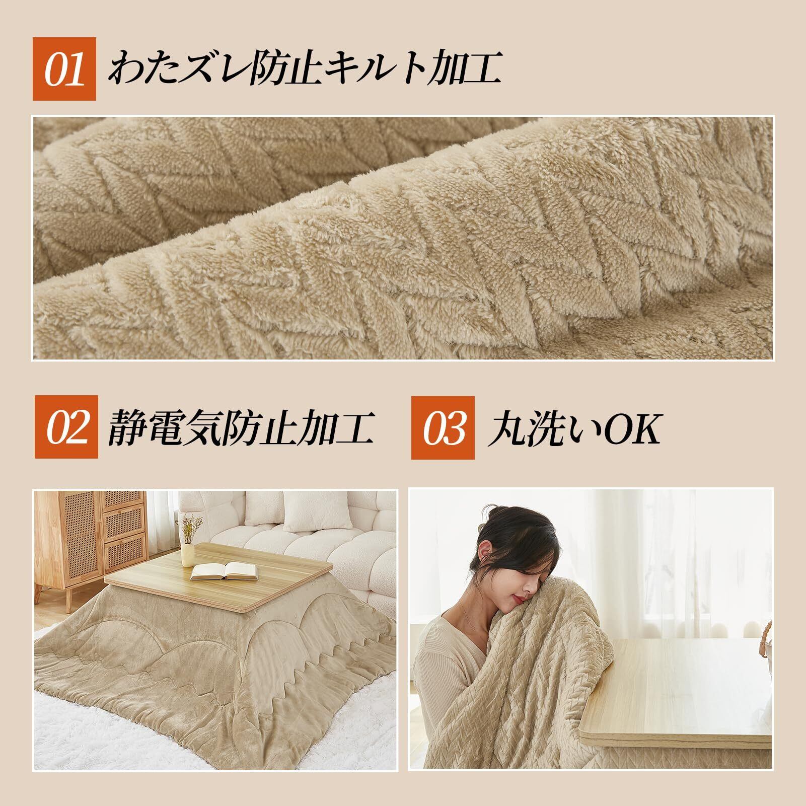 【ふわモコ暖かいフランネルこたつ布団】こたつ掛けふとん表も裏も200g/m²高密度フランネル素材を採用しており、適度な厚さで、ふわふわ、軽くて暖かい。きめ細かい繊維みとふんわりした触り心地が魅力です。なめらかでソフトな肌触り、保温性も高いので、コタツ布団に入った瞬間リラックスしてヒンヤリ感もなく、すぐに暖かさを感じることができます。ふわふわ、ぽかぽかで、寒い時期には欠かせない省エネのアイテムです