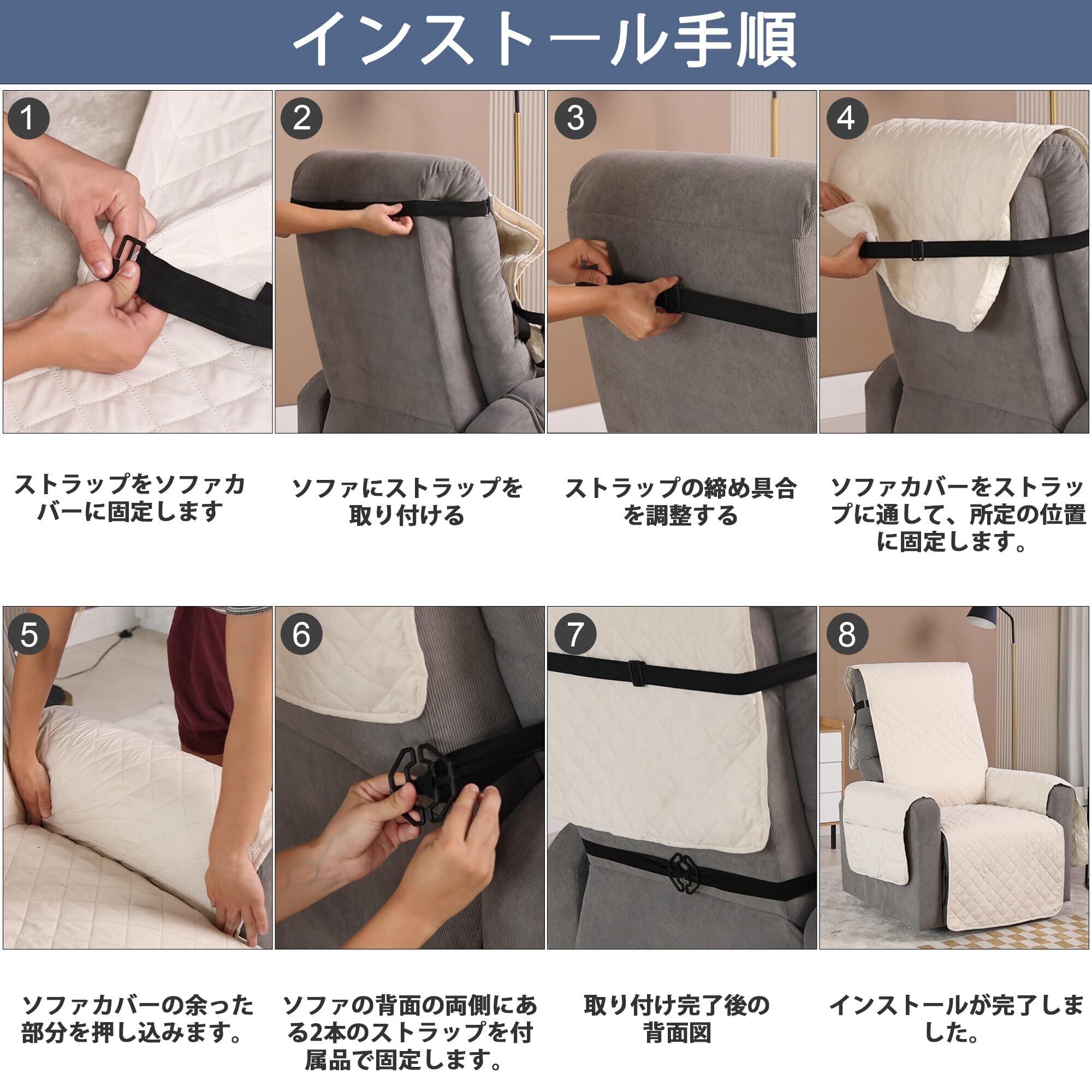 【防水】防水生地を使用しており、ある程度の水の侵入を防ぎます。誤って飲み物をこぼしたり、ペットがカバーの上にオシッコをしたりしても、すぐに液体が染み込みません。ソファカバーに液体をこぼした場合は、ペーパータオルや布で拭いてください。