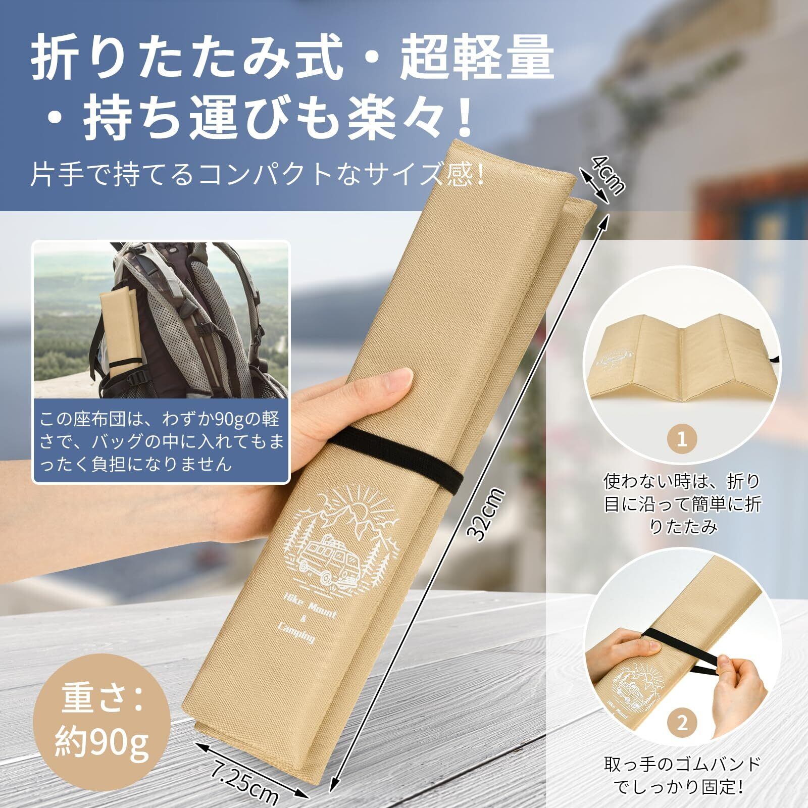 【高品質な素材と優れた仕様】折り畳みクッションは、広げた状態で約32×29×1cm、折りたたんだ状態で約32×7.25×3cmのサイズで、重量はわずか90gです。表面には耐久性に優れた600Dオックスフォード布を使用し、中間充填には発泡ポリエチレンを採用。防水性、防湿性、断熱性、通気性に優れ、色褪せしにくく、水洗い可能で、汚れも簡単に落とせます