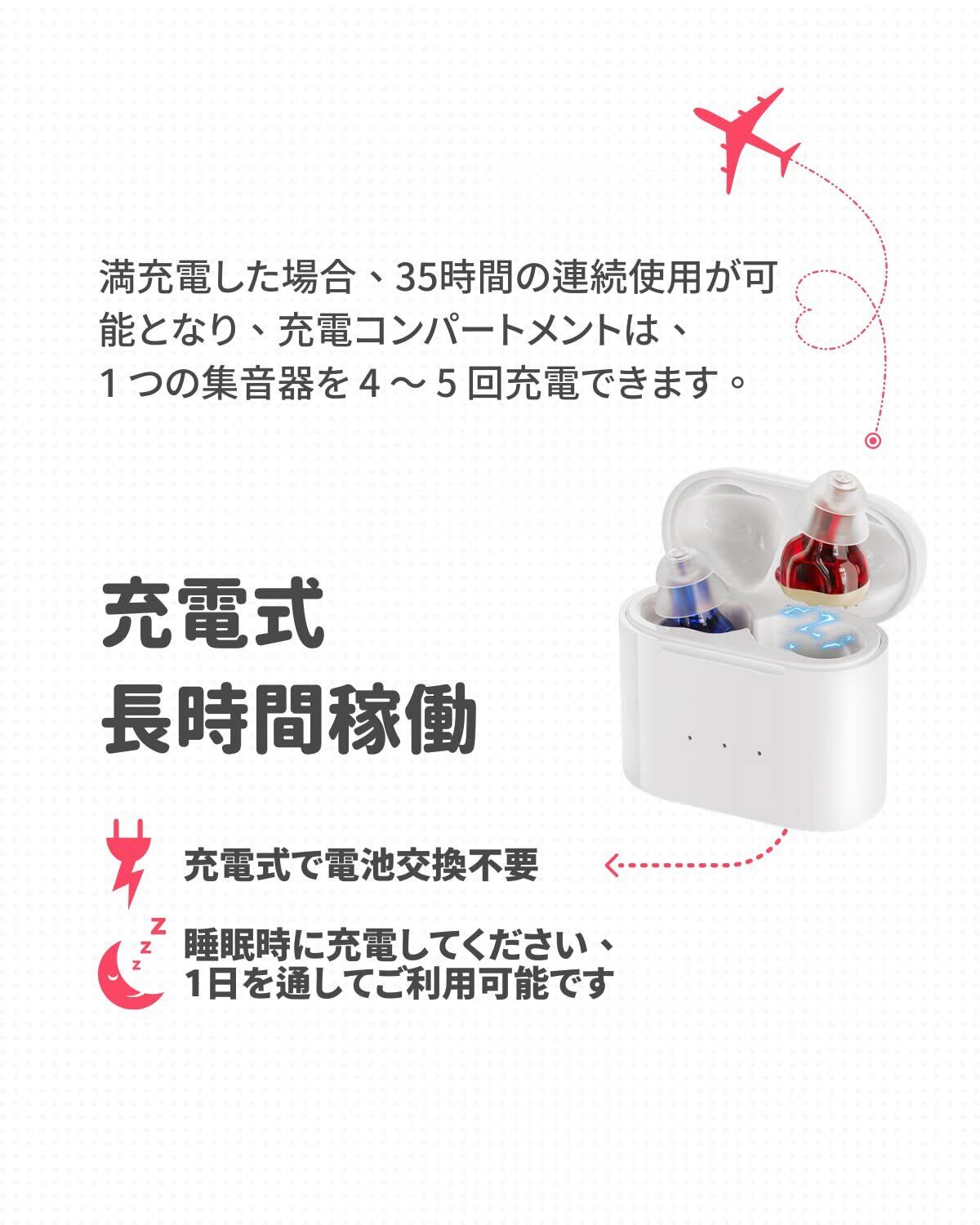【充電式・長時間稼働】USB充電式仕様に仕上がり、繰り返して電池交換の手間を省け、充電ポートに差し込むだけで充電でき、 利便性が高いです。満充電した場合、35時間の連続使用が可能となり、充電コンパートメントは、1 つの集音器を 4 ~ 5 回充電できます。 自宅はもちろん、お出かけ、旅行や登山やキャンプなどアウ トドアシーンまで幅広いシーンにご利用いただけます