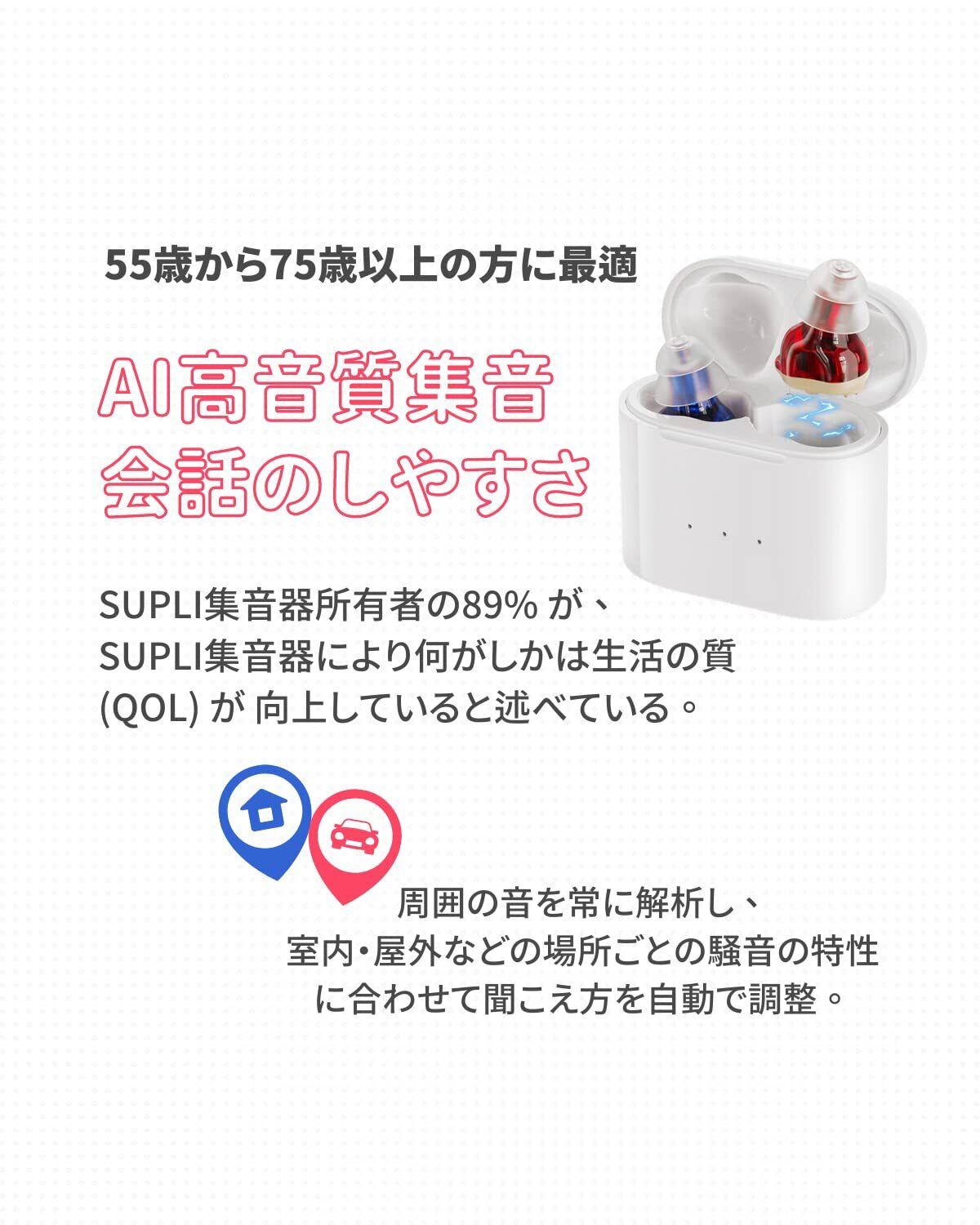 正規品 SUPLI 会話のしやすさ 両耳装用 集音器 音声拡張器 耳穴式 左右両用 充電式 音量調整 イヤーピース4個付き ノイズ抑え 軽量 小型 痛 くない 操作簡単 高齢者 敬老の日 父の日 母の日 プレゼント