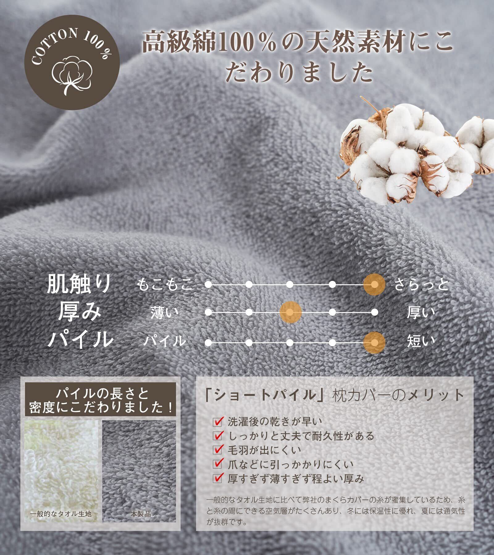 【抗菌防臭・オールシーズン使える】抗菌防臭加工で細菌の増殖を抑制し、防臭効果を発揮します。吸水性が高い枕カバーは寝汗素早く吸収し、サラサラカバーです。コットン素材のパイル地は、夏の汗対策や冬の寒さ対策に効果があり、一年中オススメ。