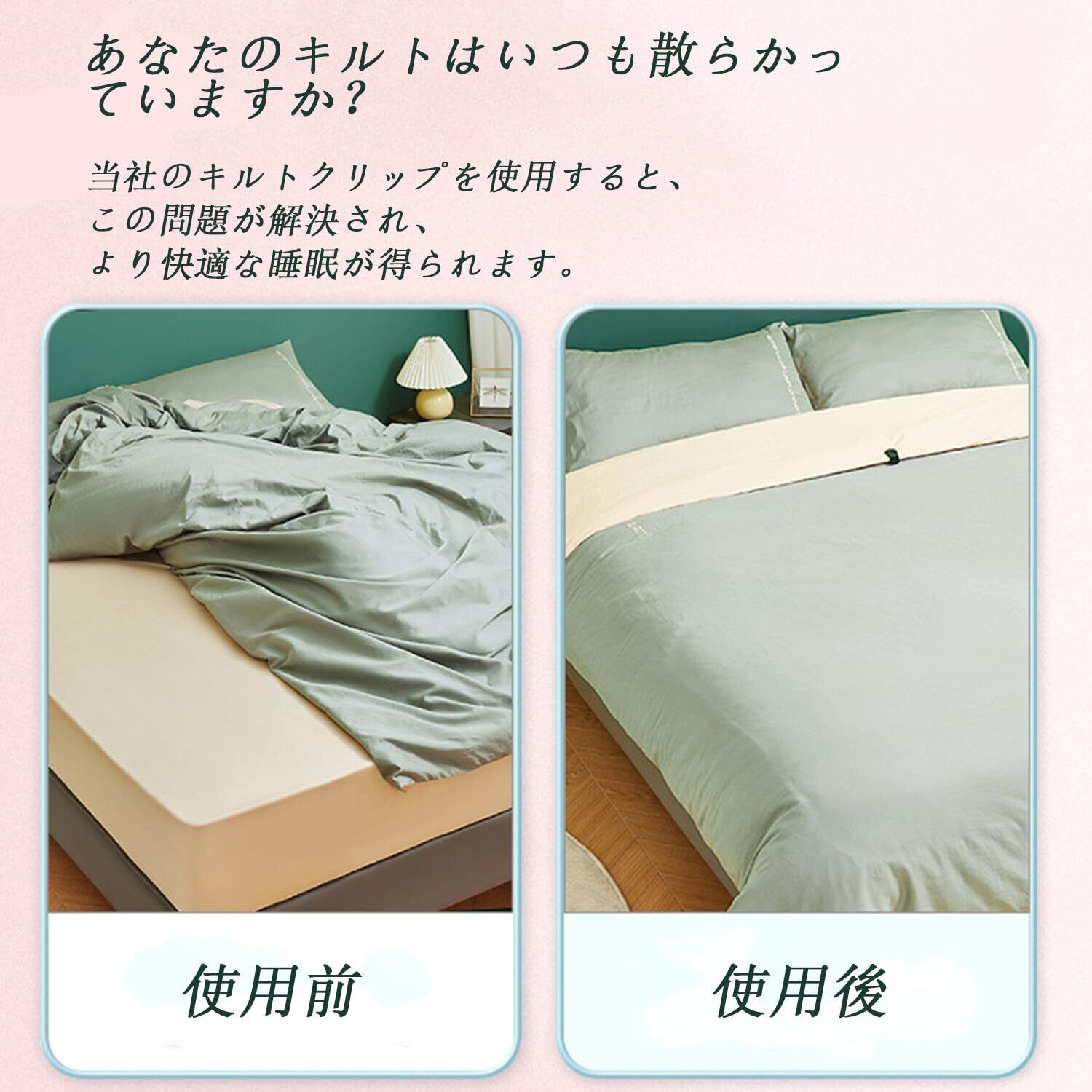 【針のないデザイン】弊社のキルトクリップは針のないデザインを採用しています。 そのため、クリップが皮膚や寝具に食い込む心配はありません。 さらに、滑り止めストライプのデザインにより、クリップでキルトをしっかりと固定し、就寝中のズレや移動を防ぎます。軽量設計なので掛け布団に重さを加えません。