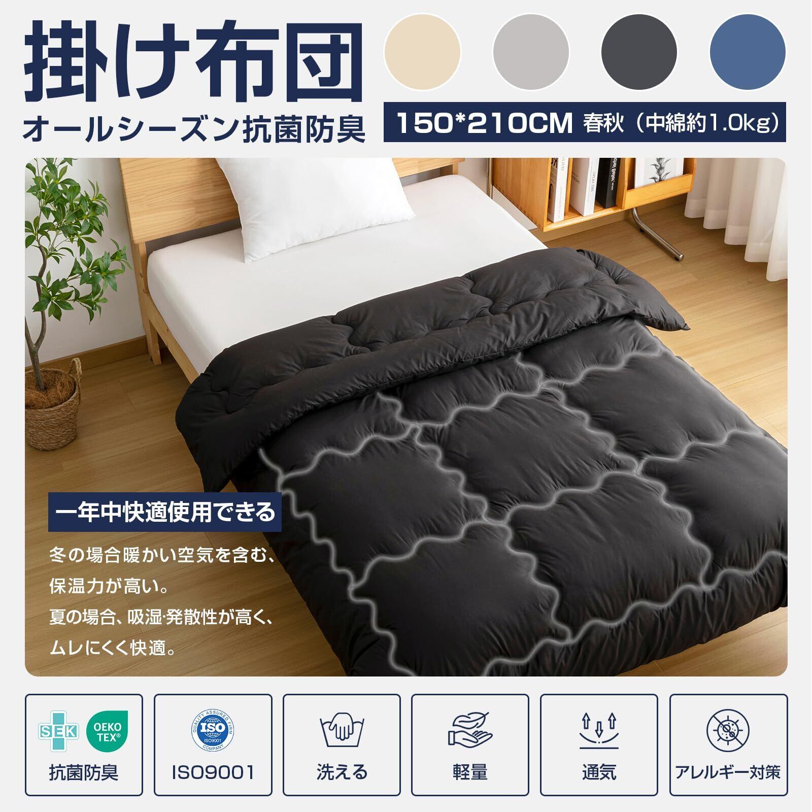 Matdeco 掛け布団 シングル オールシーズン かけ布団 洗える SEK衛生認証 抗菌防臭 防ダニ 肌布団 吸水速乾 暖かい 掛けふとん 軽量 春夏秋用 約1.0KG 無地 150x210cm ブラック(12グリッド)