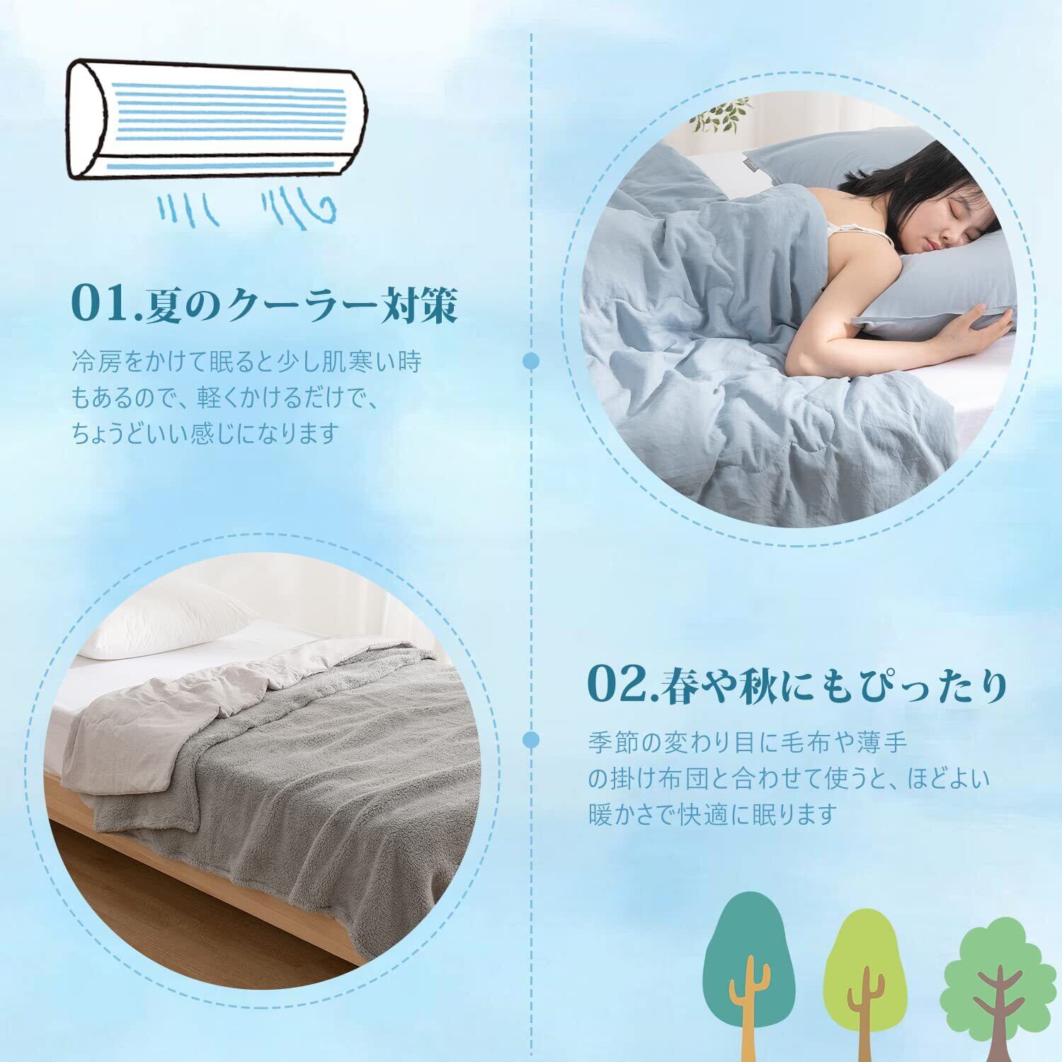 ふんわり軽い超軽量なので、やさしく体を包み込み、心地よい眠りを誘います。