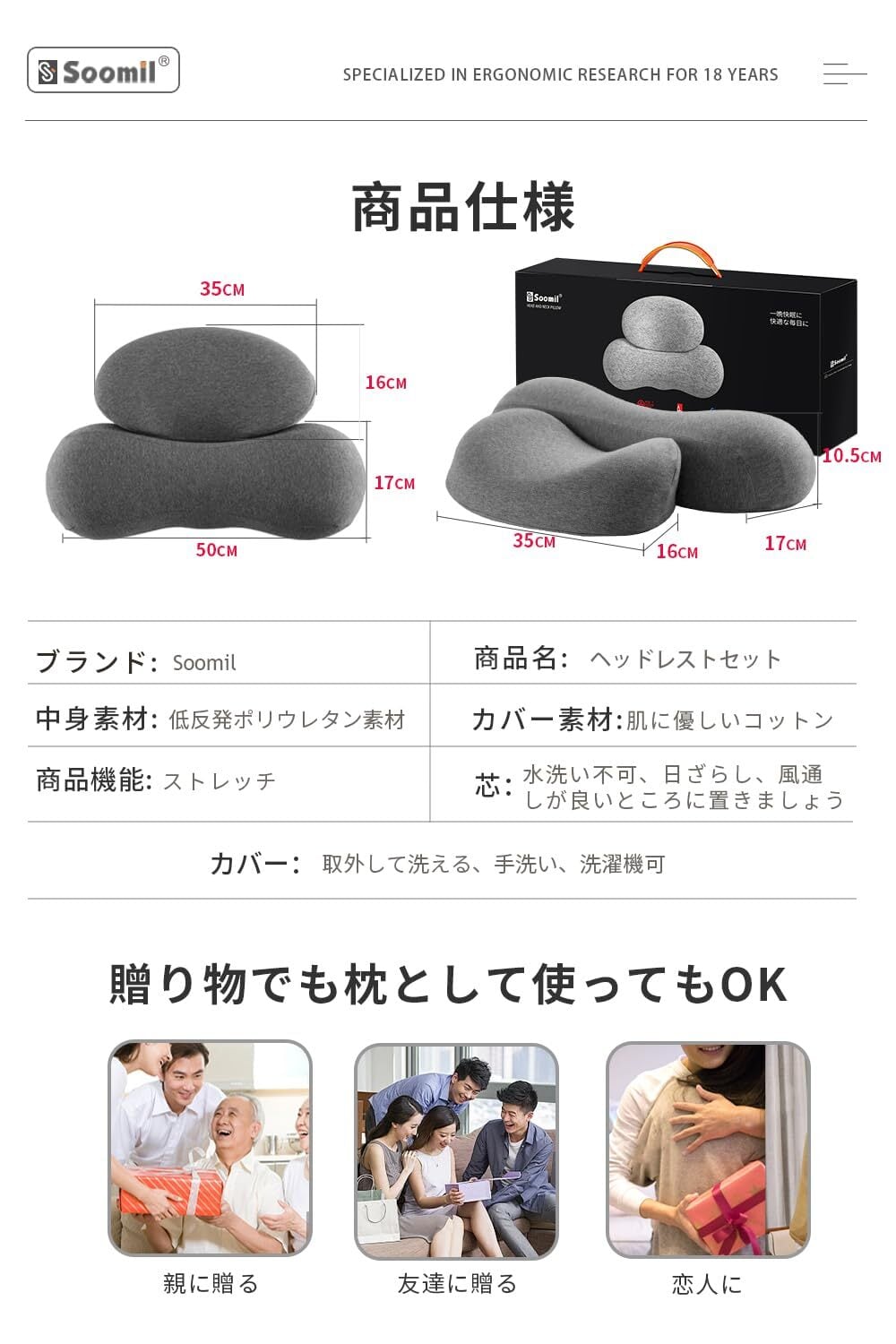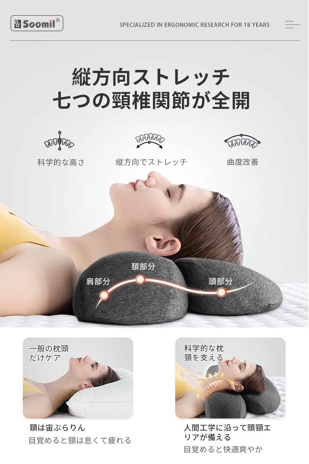【新着商品】【睡眠の専門家監修】Soomil 枕 低反発 首枕 首が痛くならない まくら 安眠枕 ネックピロー 伸ばす 首や肩の負担にならない 通気性 カバー洗濯可 誕生日プレゼント 男性 女性 ギフト 母の日 父の日(ダークグレー)