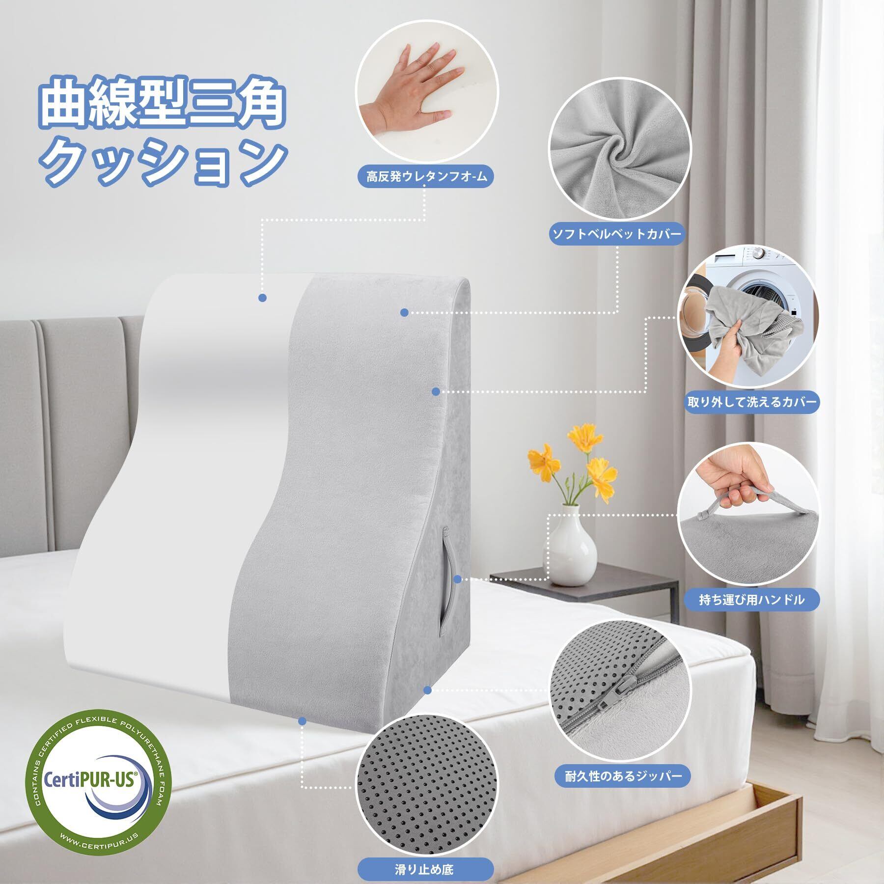 Azamia 三角クッション 腰枕 三角枕 背もたれ クッション 高さ調節可能 傾斜枕 足まくら 横向き寝 体位変換 テレビ枕 大きい 高反発 ウェッジ枕 背あて ランバーサポート ベルボア生地 カバー洗える グレー