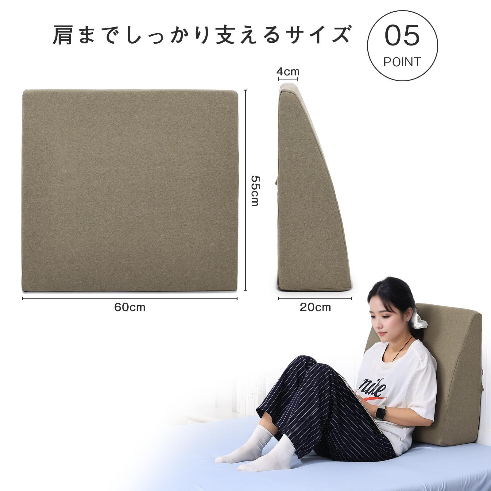 【人間工学に基づいた三角形デザイン】背中の自然なカーブに合わせて、理想とする曲線の背筋を支え、体圧分散。高さもたっぷりあるので、腰から肩までしっかり支えます。肩と背中をリラックス!読書やテレビ鑑賞などのくつろぎたい時の姿勢サポートに最適です。また、妊婦さんや病後の方の負担軽減にも役立ちます。