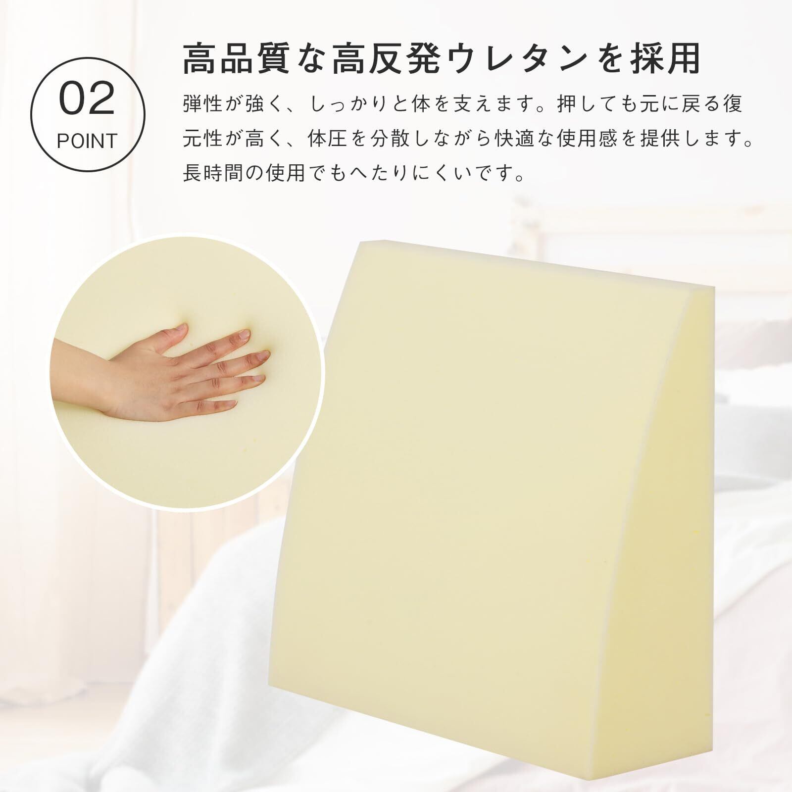 【適当な反発力のウレタンを採用】柔らかすぎず硬すぎない適度な反発力で、体圧が吸収・分散され、腰と背中にほどよい厚みで快適な心地を提供し長時間座っても疲れません。押しても元に戻る復元性が高く、体圧を分散しながら快適な使用感を提供します。長時間の使用でもへたりにくいです。