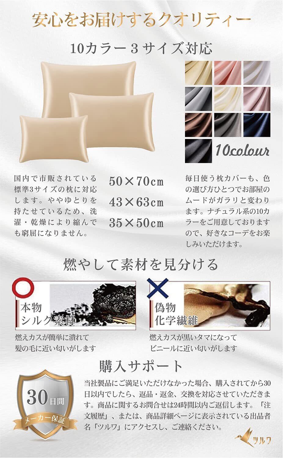 【仕様・セット内容】表地:最高品質6Aクラス22匁シルク100% 裏地:テンセル(リヨセル)100%。封筒式枕カバー、シルクとテンセル二種類の生地を合わせたリバーシブル仕様。Sサイズ:35×50cm、Mサイズ:43×63cm、Lサイズ:50×70cm ※オリジナルパッケージ、取り扱い説明書、カード ※収納用チャック付きポリ袋 長さ:23cm、幅:17cm ※シルク素材確認用の生地片(天然シルク100%の本物である確認に、切れ端の試験片も付属しております。)