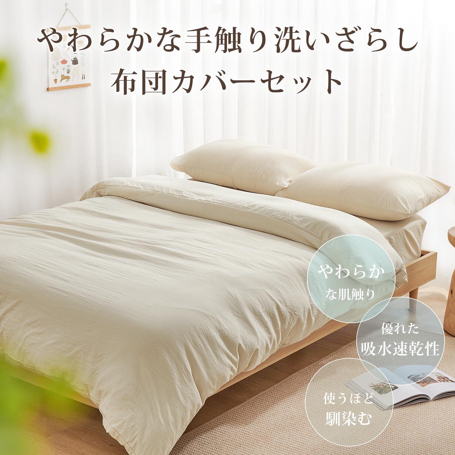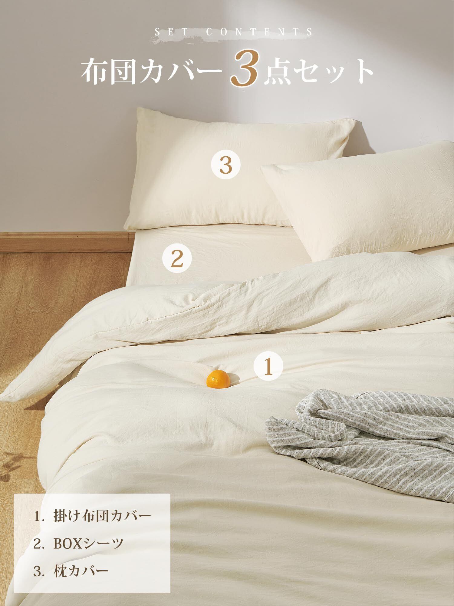 【特価セール】クモリ(Kumori) 寝具カバーセット 布団カバーセット 洗いざらし シワ加工 水洗い やわらか (掛け布団カバー ボックスシーツ 枕カバー)吸水速乾 丸洗いOK 肌に優しい 洗える 無地 シンプル オールシーズン(シングル・3点セット アイボリー)