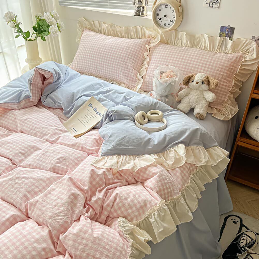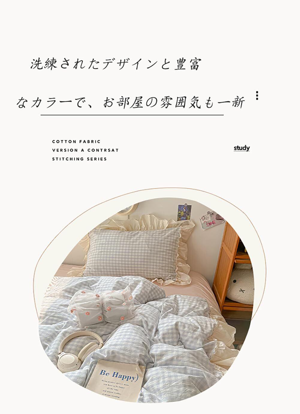 【チェック柄デザイン】チェック柄とフリルの組み合わせで、ノスタルジーな雰囲気を演出。可愛らしさと上品さを両立し、ベッドルームに温かみのある空間を作り出します。カジュアルなインテリアにも相性抜群で、毎日のくつろぎ時間を特別なものにします。