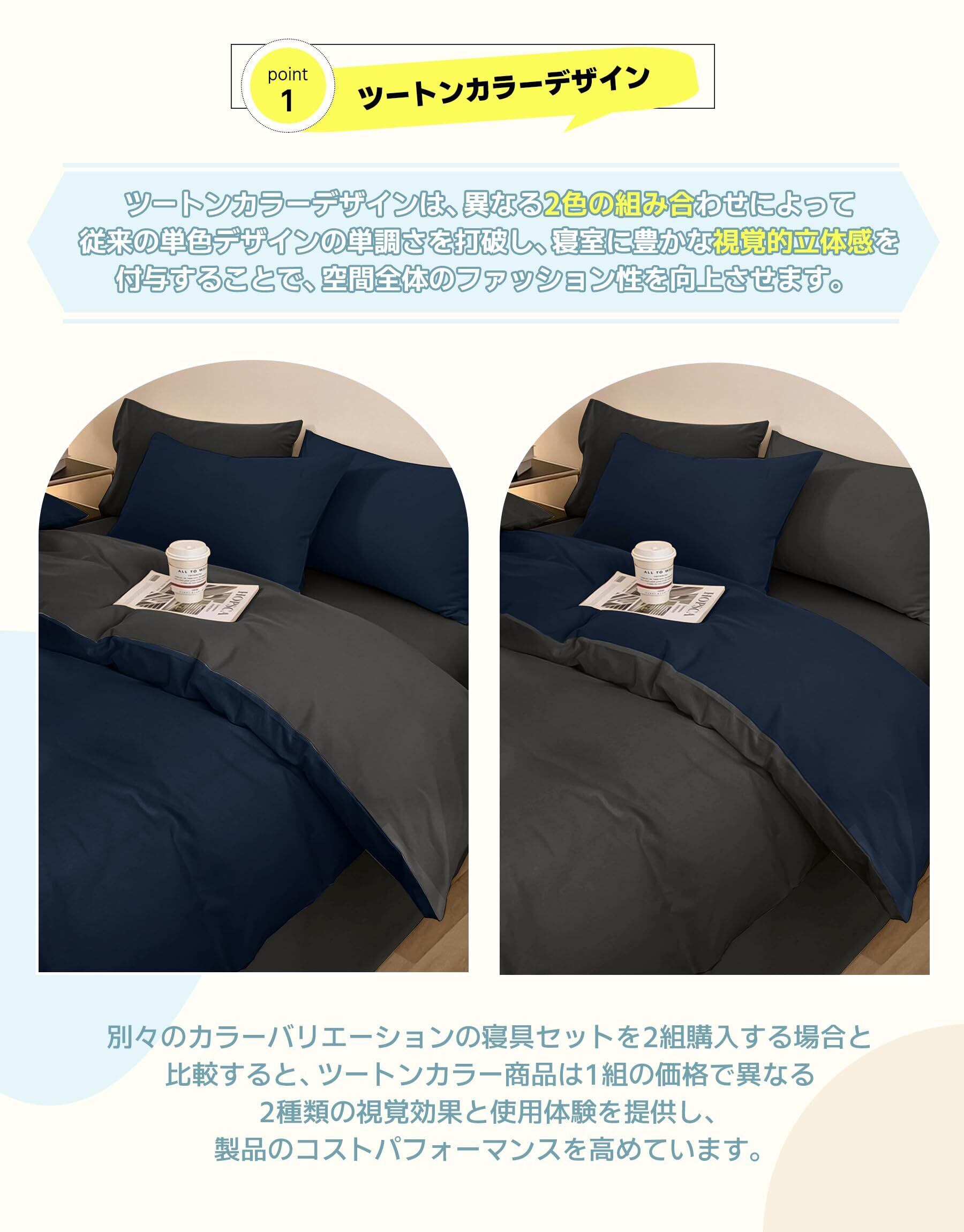 【デザイン性抜群 ツートンカラーデザイン】掛け布団カバー・ボックスシーツ・枕カバーに洗練された2色配色を採用。色の境界線に精密なステッチ加工を施し、洗濯でも色落ち・色混ざりせずデザインを維持。従来の単色デザインを進化させ、お部屋のインテリアに立体感とモダンなアクセントを添えます。