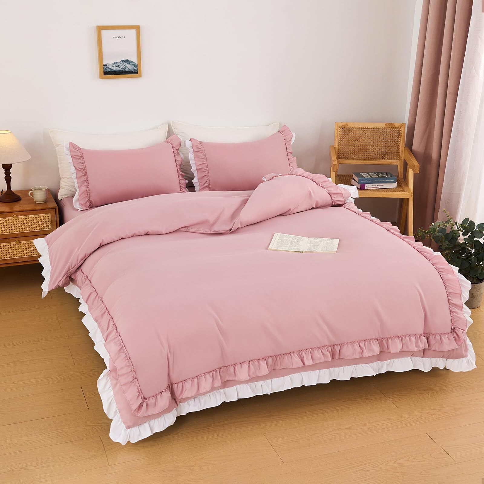 HOdo Home 布団カバー シングル 3点セット 掛け布団カバー ベッドカバー 枕カバー ベッドシーツ ボックスシーツ 洋式・和式兼用 寝具カバーセット フリル付き ピーチスキン加工 姫系 洗い替え速乾(ピンク・シングル)