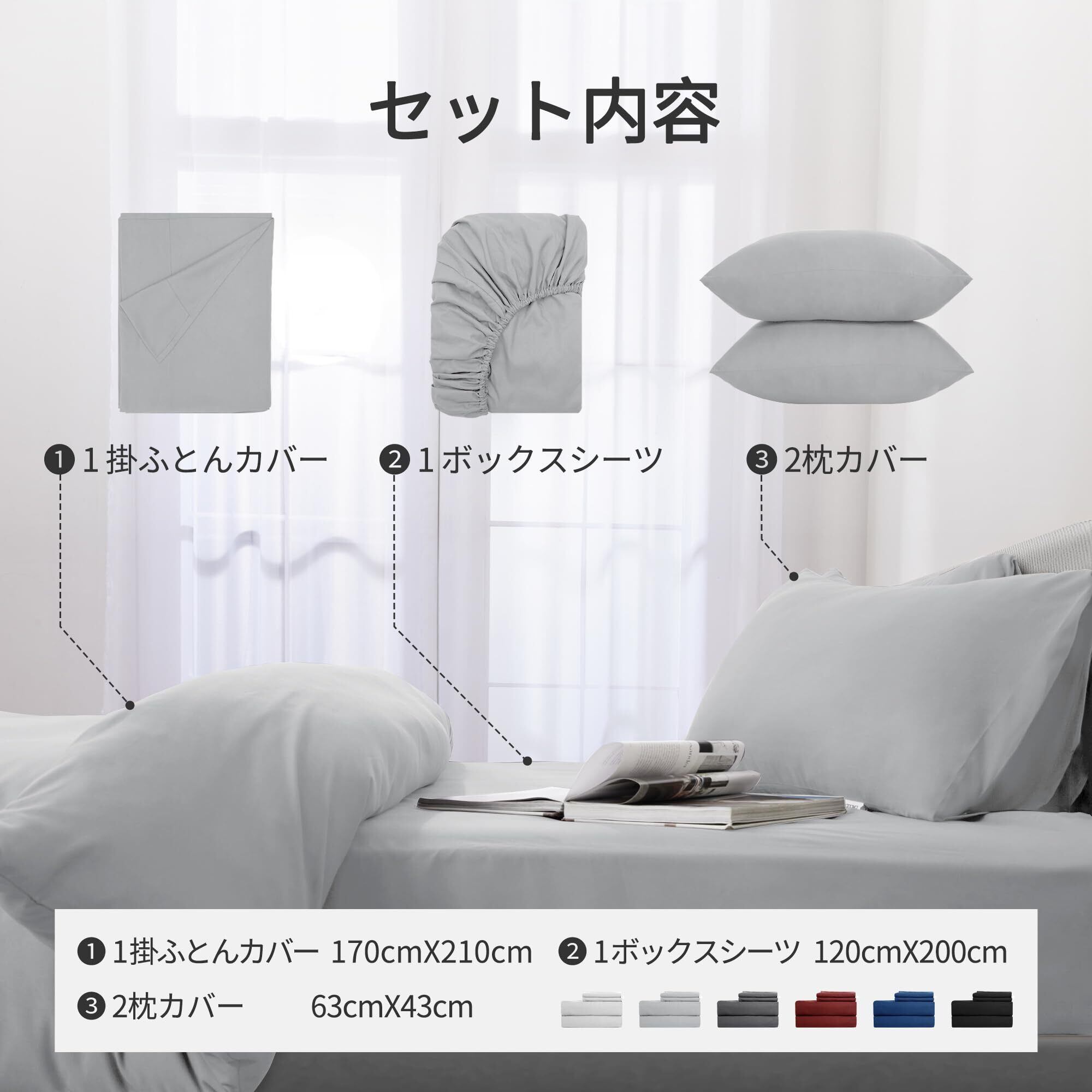 【商品仕様】素材:ポリエステル100%。その素材にはやわらかいです。環境に優しい素材は肌に優しく、寝心地が非常にいいです。セット内容:掛け布団カバー(1枚):170X210cm(セミダブル);ボックスシーツ(1枚): 120X200X30cm;高さ3-28cmの敷き布団とマットレスに対応できます。枕カバー(2枚): 封筒式(43x63cm)。シンプルで無地な設計を採用しており、お部屋を広く明るく見せ、高級感が溢れています。
