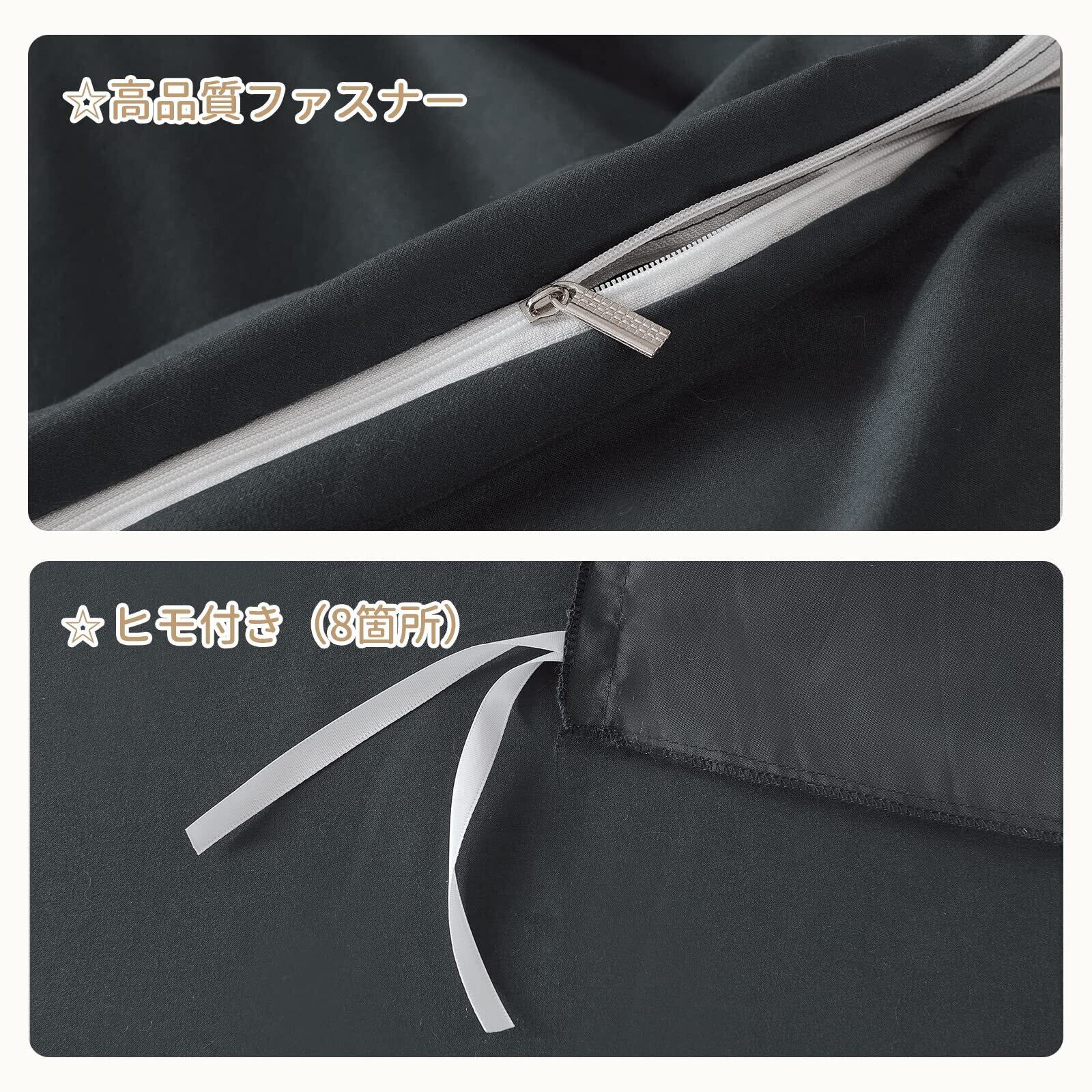 【セット内容・仕様】「掛け布団カバー・150x210cm(1枚)」:片側に丈夫な170cm長さのファスナーを使用、布団留め紐8ヶ所付き。無地で色は派手すぎずにどんなインテリアにもピッタリと雰囲気を合わせます。
