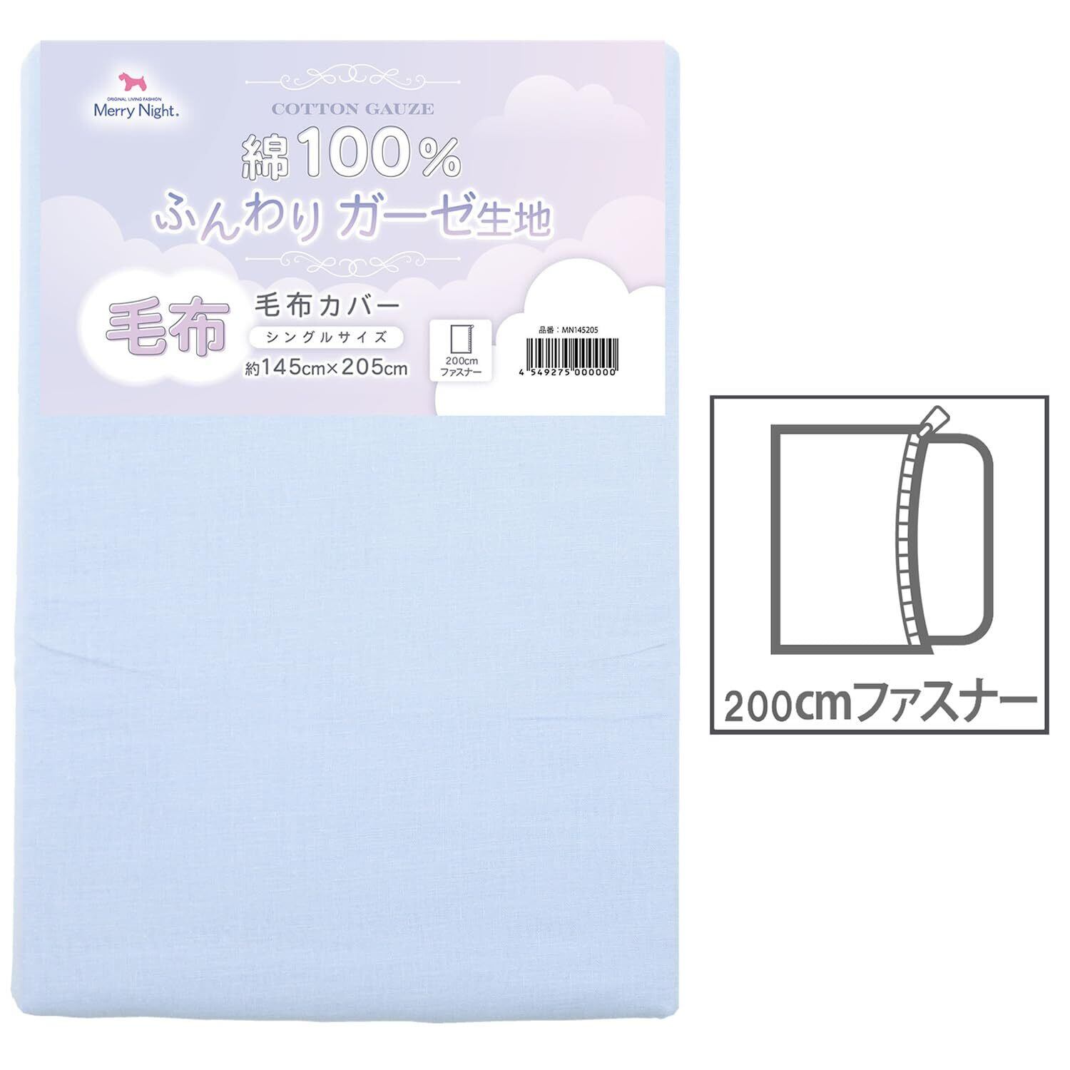 メリーナイト 毛布カバー ガーゼ ブルー シングル 約145×205cm 綿100% 軽量 通気性 ふんわりやさしい肌触り 吸水性 洗える すぐ乾く 衛生的 清潔 毛布の毛羽の飛散を防ぐ 秋冬寝具 MN145205-76