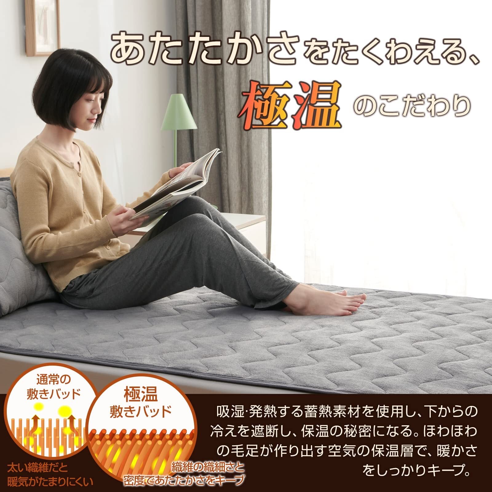 【素材・なめらかで極上の肌触り】[素材] 表面:高密度プレミアムフランネル生地、裏面:ワッフル生地、中綿:蓄熱綿(ポリエステル100%)敷きパッドは暖かさだけでなく、肌触りも追求。なめらかで気持ちの良いフランネル生地にすることで、睡眠の心地よさを向上させます。ふわっとした触感と暖かさが相まって、身体だけでなく心までぽかぽかにいたします。