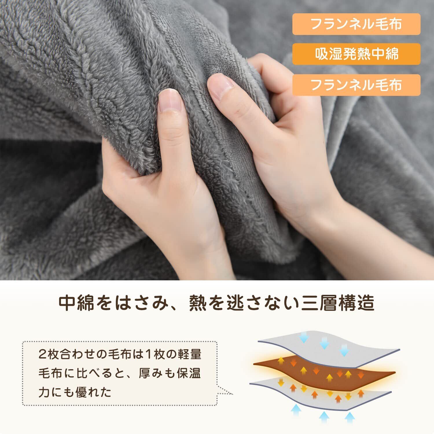 【あったか三層構造】2枚の毛布を合わせて吸湿発熱中綿をたっぷりいれて、体から発散する汗などの湿気を吸収し、熱に変換する繊維を使っている毛布なので、暖かい空気を毛布に閉じ込め、保温力がさらにアップする。