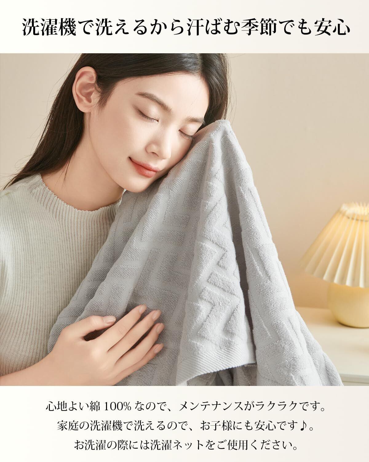 【丁度いい厚さの安心感】特别な加工でふっくら”"さらり"とした心地よい肌ざわりのパイルに仕上けました。一般的なタオルケットと比較するとボリコームがあり、からだに掛けた時のほどよい厚みが、満足感を与えてくれます。寝汗をしっかり吸水嫌なべタつき感がなく、冷房対策にもおすすめで、毎朝、気持ちのいい目覚めます。