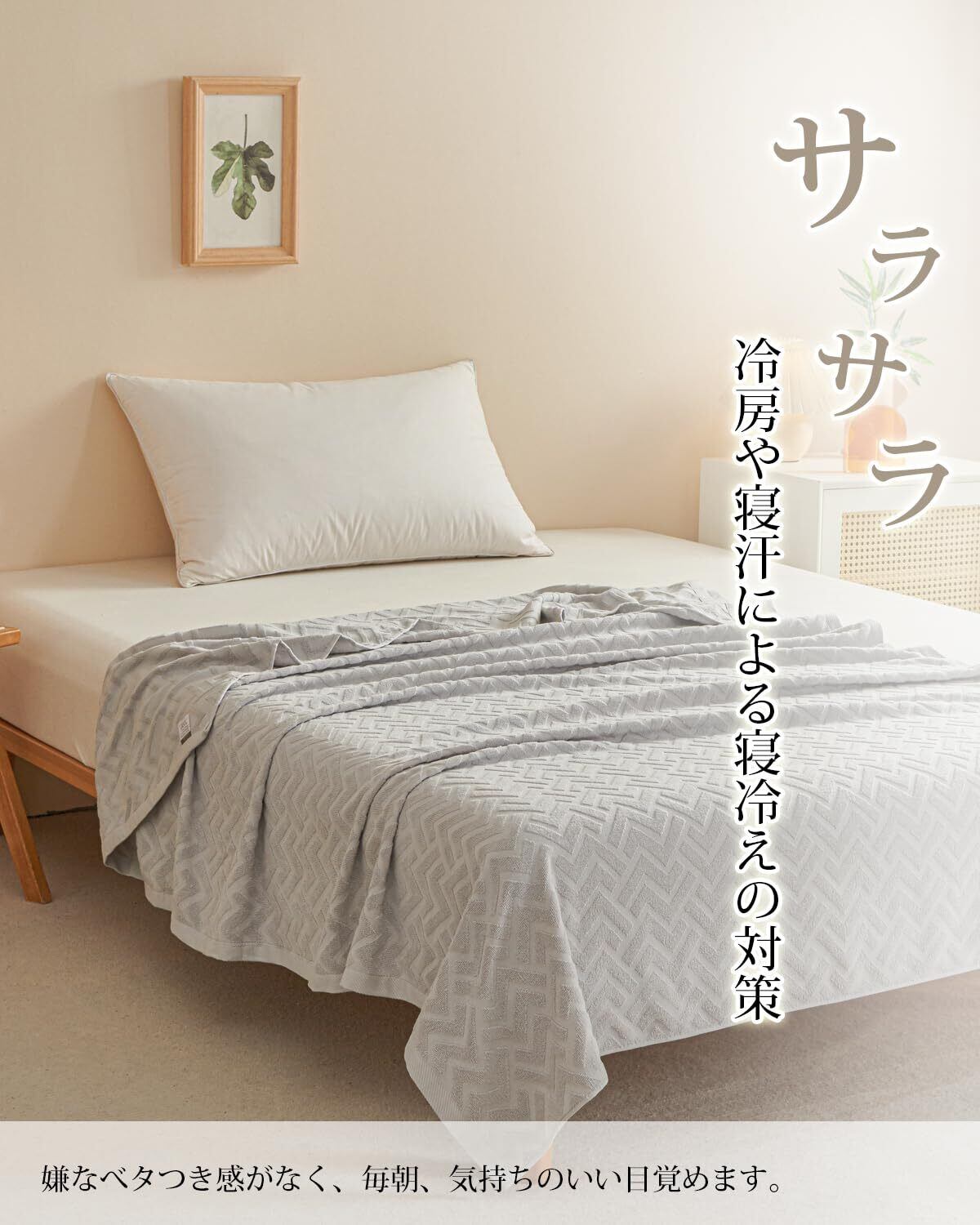 【オールシーズンで快適】春夏秋はサラサラと快適で、冬はじんわりと暖かいので、季節を問わず一年を通じて使用できます。一年中出しっばなしできるので、収納が不要です。寝具としてだけでなく、冷房対策、ソファーや椅子の上での膝掛けや昼寝用のケット、旅行時の携帯用毛布としても便利です。