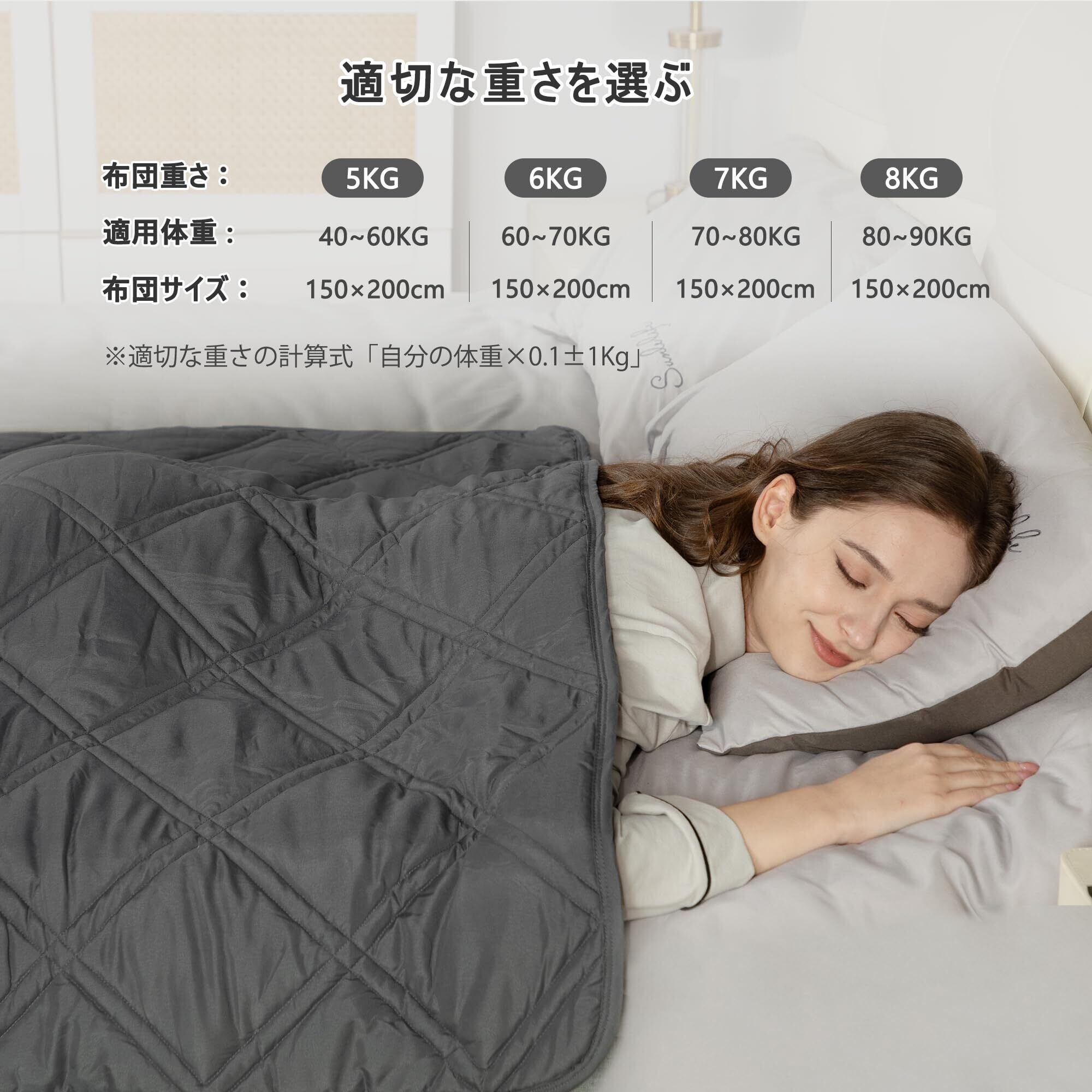 【心地良い重さ】重めの掛け布団が好きな人におすすめです。加重ブランケットを選ぶとき、自分の体重×0.1±1Kg程度でお好みのサイズをご選択ください。5kg(体重範囲/40kg~60kg)、6kg(体重範囲/60kg~70kg)、7kg(体重範囲/70kg~80kg)、8kg(体重範囲 /80kg~90kg)。ブランケットサイズ:150X200cm(シングル布団)、※初めて試す場合は5㎏または7㎏から始めるのがオススメです。