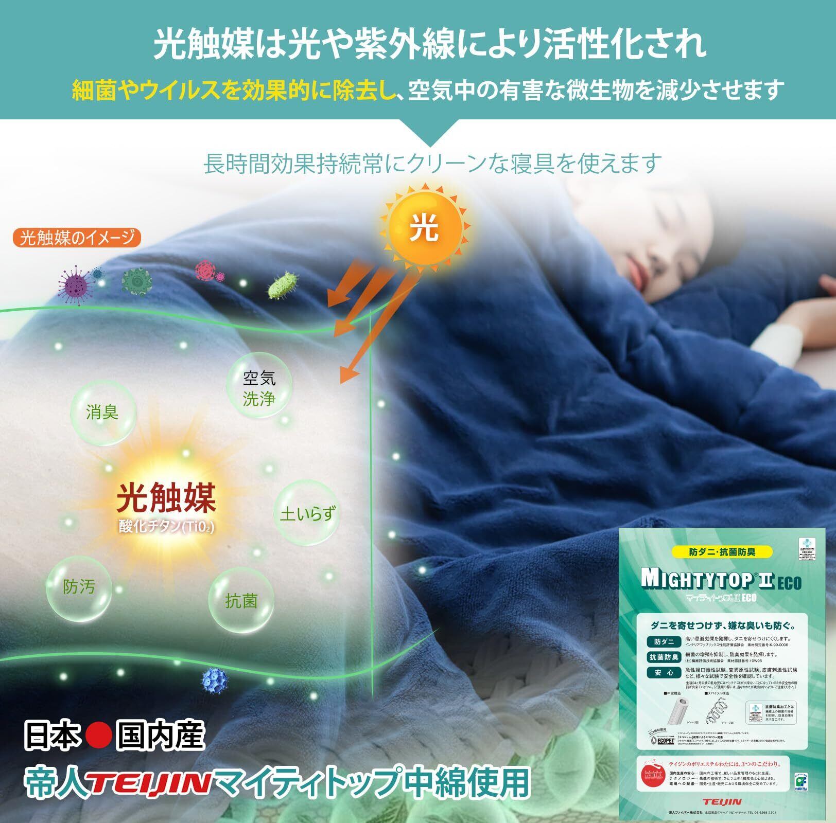【ダブル抗菌防臭】この毛布には、帝人の「マイティトップⅡECO」抗菌防臭・防ダニ中わたを使って、光触媒加工が施されており、細菌やウイルスの除去、臭い分子の分解を通じて、清潔で快適な環境を保ちます。高い忌避効果でダニの繁殖も防ぎ、小さなお子様にも安心してご利用いただけます。