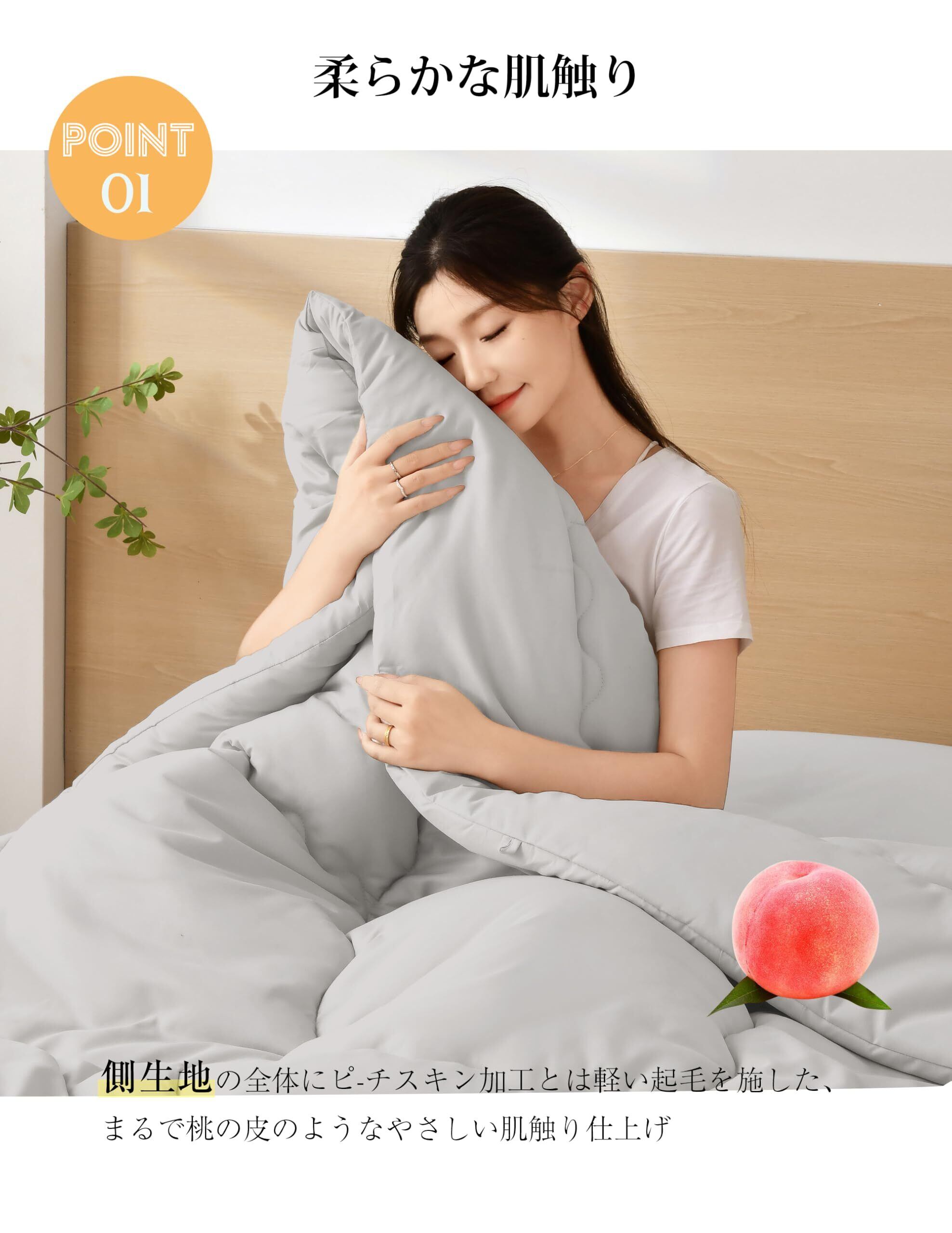 【商品仕様 フワっと軽い】掛け布団サイズ:190x210cm(シングル)/表側の素材:ポリエステル100%(ピーチスキン加工)/中綿の素材:中空構造のポリエステルわた100% 。中綿には綿切れしにくい中空ポリエステル綿を使用しています。アレルギーの原因となるホコリが出にくい素材です。高品質の中空綿は保温性と軽さに優れ、超極細繊維構造が空気をたっぷり含むので、ふんわりと軽く体を包み込み、より快適な寝心地を実現します。女性でも持ち運び楽々!来客用にも最適です。
