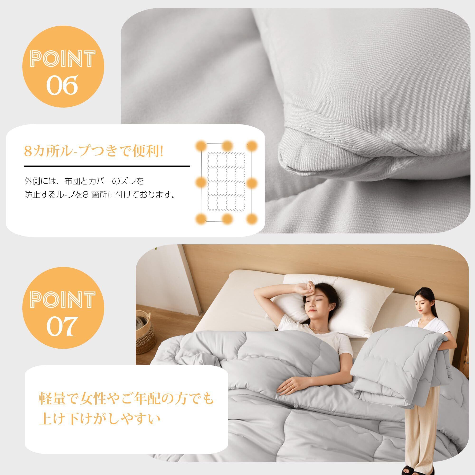 【ピーチスキン加工 柔らかな肌触り】表生地にはピーチスキン加工が施されており、柔らかく滑らかな肌触りでしっとり気持ちよく、蒸れにくくなっています。洗濯しても色落ちしにくく、中綿も硬くなりにくいので、敏肌の方でもお使いいただけます。端には滑り止めリングが8ヶ所付いているので、布団がズレる心配はありません。