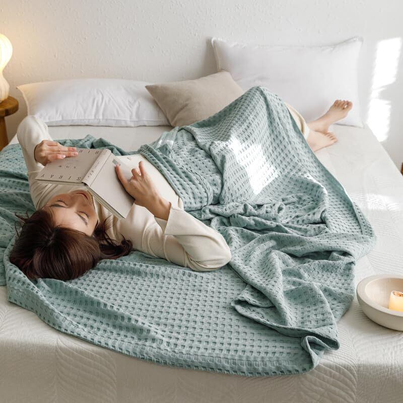 【2022最新】songlibing ワッフルケット 綿100% タオルケット クイーン200*230cm ブランケット 夏用 冷房対策 キルトケット おしゃれ 無地 洗える 寝具 ブルー