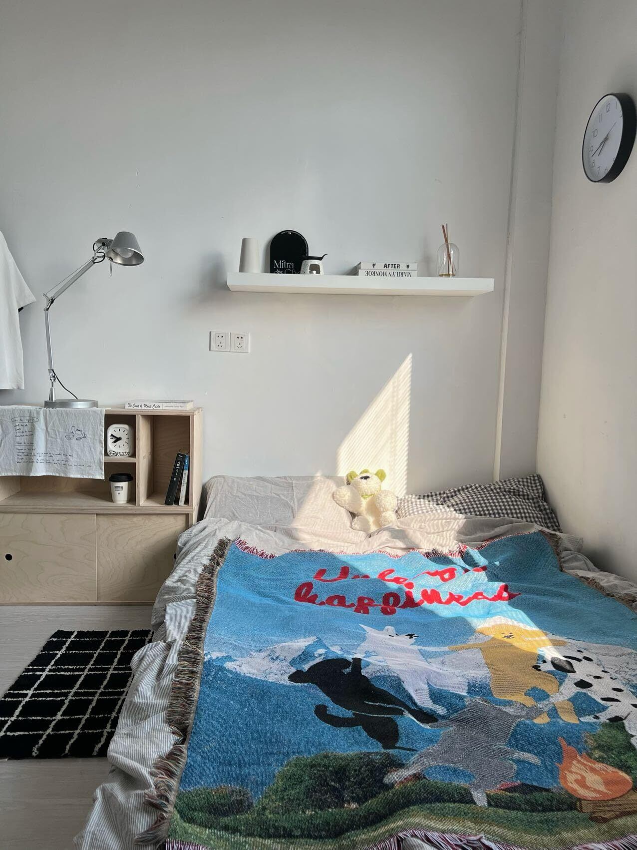 柔らかな肌触りとキュートな犬のイラストが、お部屋に癒しと幸せな雰囲気をプラスします。ナチュラルで温かみのある北欧テイストと、韓国風のトレンディなセンスが融合した、おしゃれな空間作りに最適な一品です。