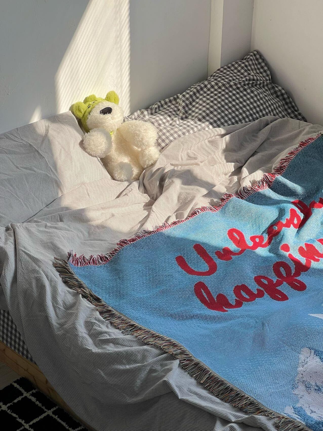 韓国風の洗練されたインテリアにぴったりで、ベッドカバー(130×160cm)としても、ソファーカバーやルームブランケットとしても使える多機能アイテム
