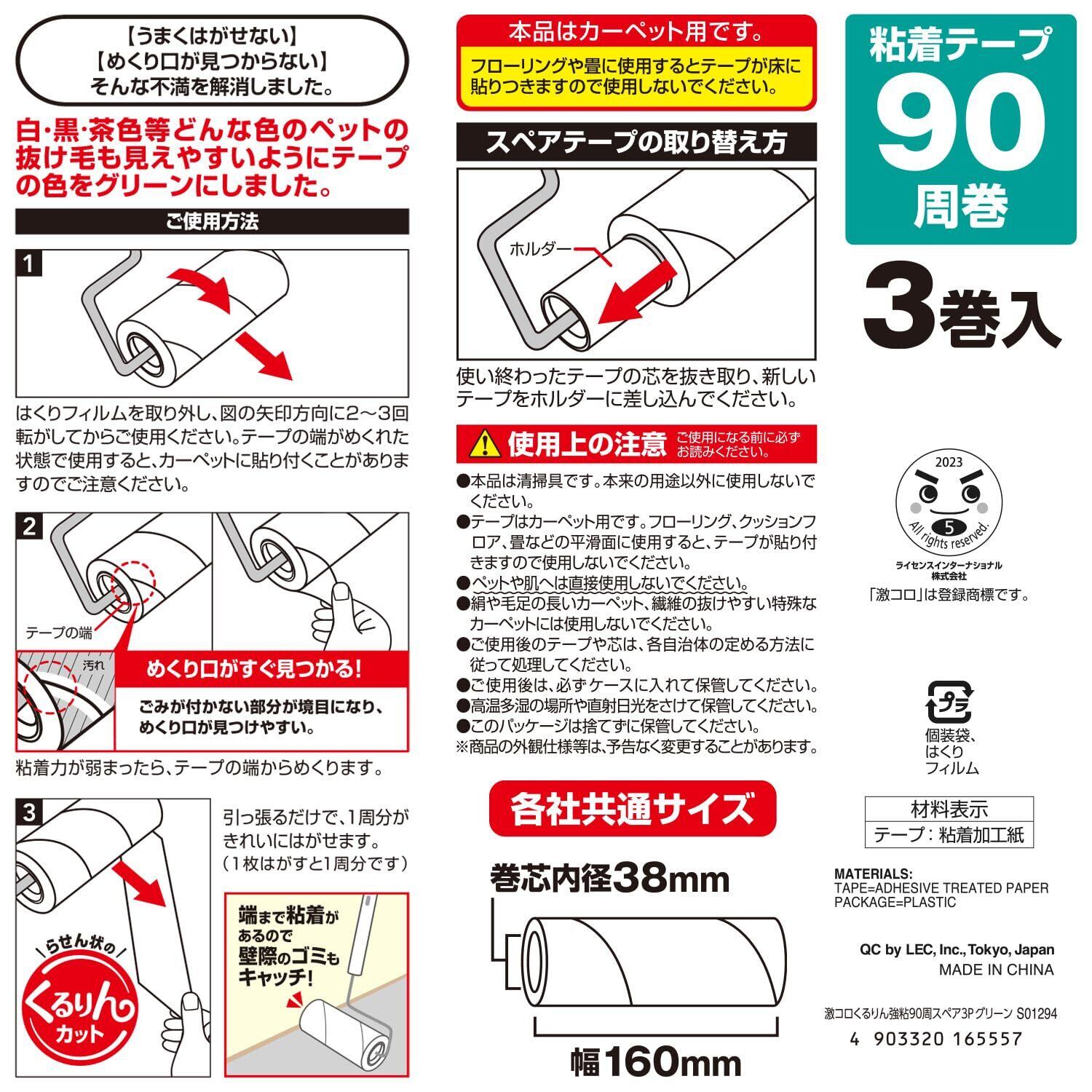 激コロくん ななめにめくるだけ 簡単くるりん カット グリーン (90周巻 × 3本) 強粘着/どんな毛色もよく見えるペット用/つまんでひっぱるだけでキレイにはがせます/カット不要/カーペット用