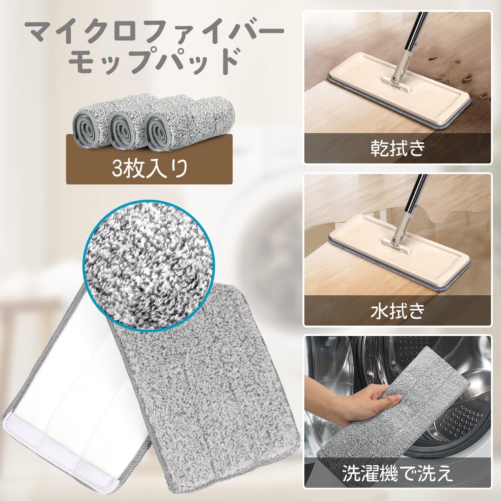 乾湿両用:各モップバケツセットには、洗濯機で洗えて再利用可能な3つのマイクロファイバーパッドが含まれています。吸水性や脱水性も抜群です。乾拭きの場合は、髪の毛やホコリなど細かいゴミを効果的に除去できます。水拭きの場合は頑固な汚れが適用します。
