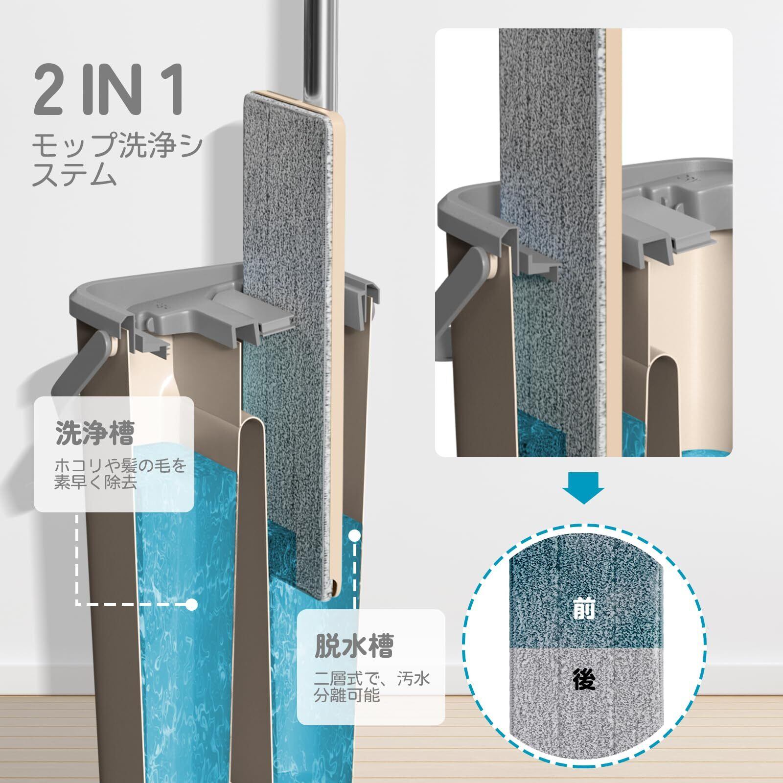 汚水分離:バケツは洗浄と脱水二槽式で、清潔な水と汚れた水を分離可能です。立ってまま、フロリングモップをバケツに上下に動かすだけで、簡単に洗浄や絞りできます。もう手を汚すことはありません。