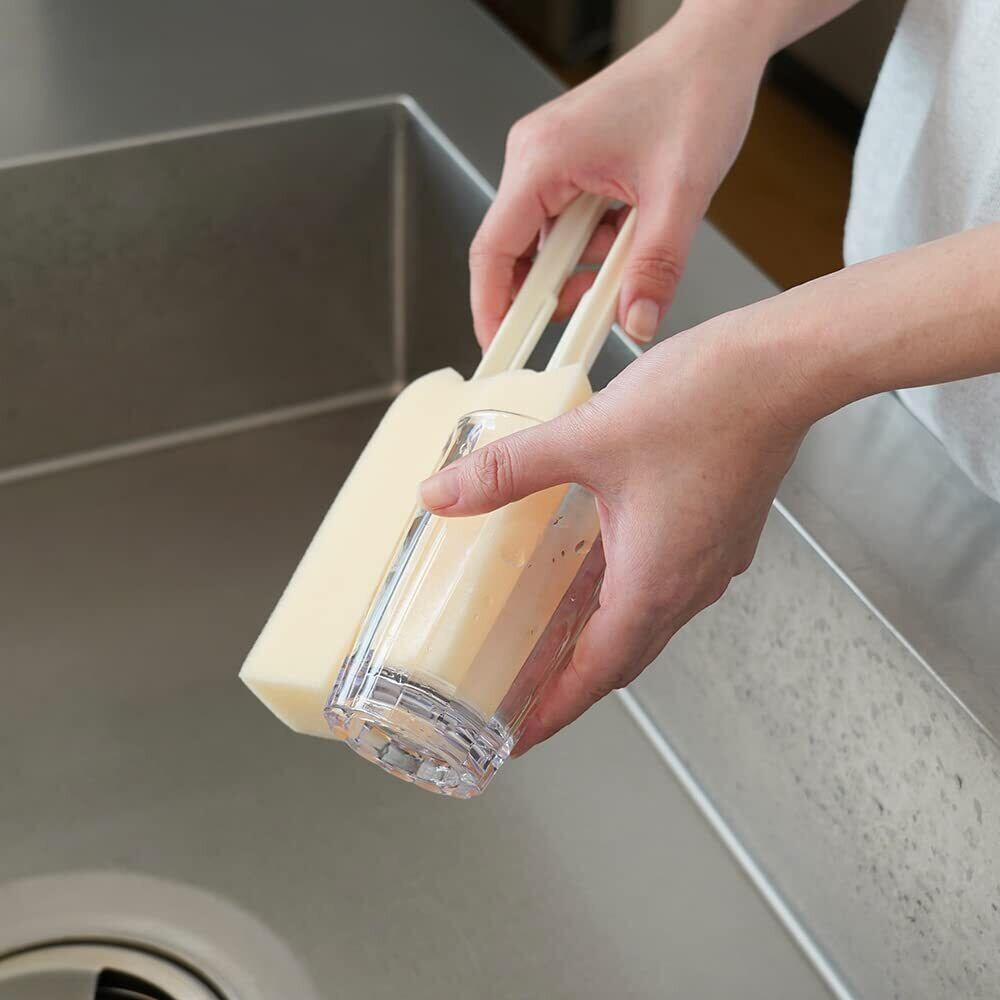 【はさんで両面を洗える】2つに割れたスポンジでコップをはさみ、回しながら洗えば、コップの内側と外側を同時に洗うことができます。