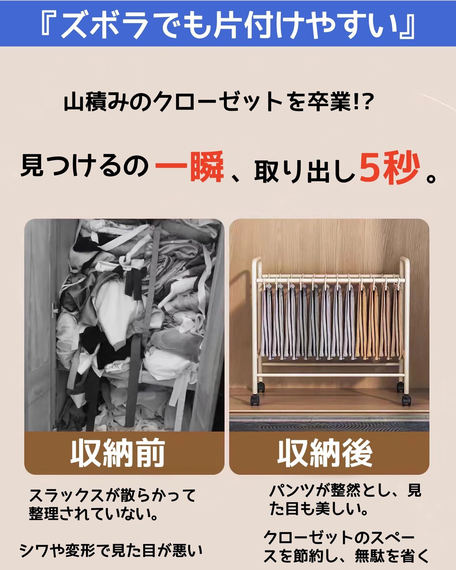 【移動ラクラク、どこでも収納可能】ClutterFreeのスラックスハンガーラックはキャスター付きで頑丈なスチール製なので軽くて移動がラクラク、ストッパーが付いているのでクローゼットやウォークインクローゼット、押し入れなどにも収納可能です 好きな時に好きな場所に置いて活用できる!