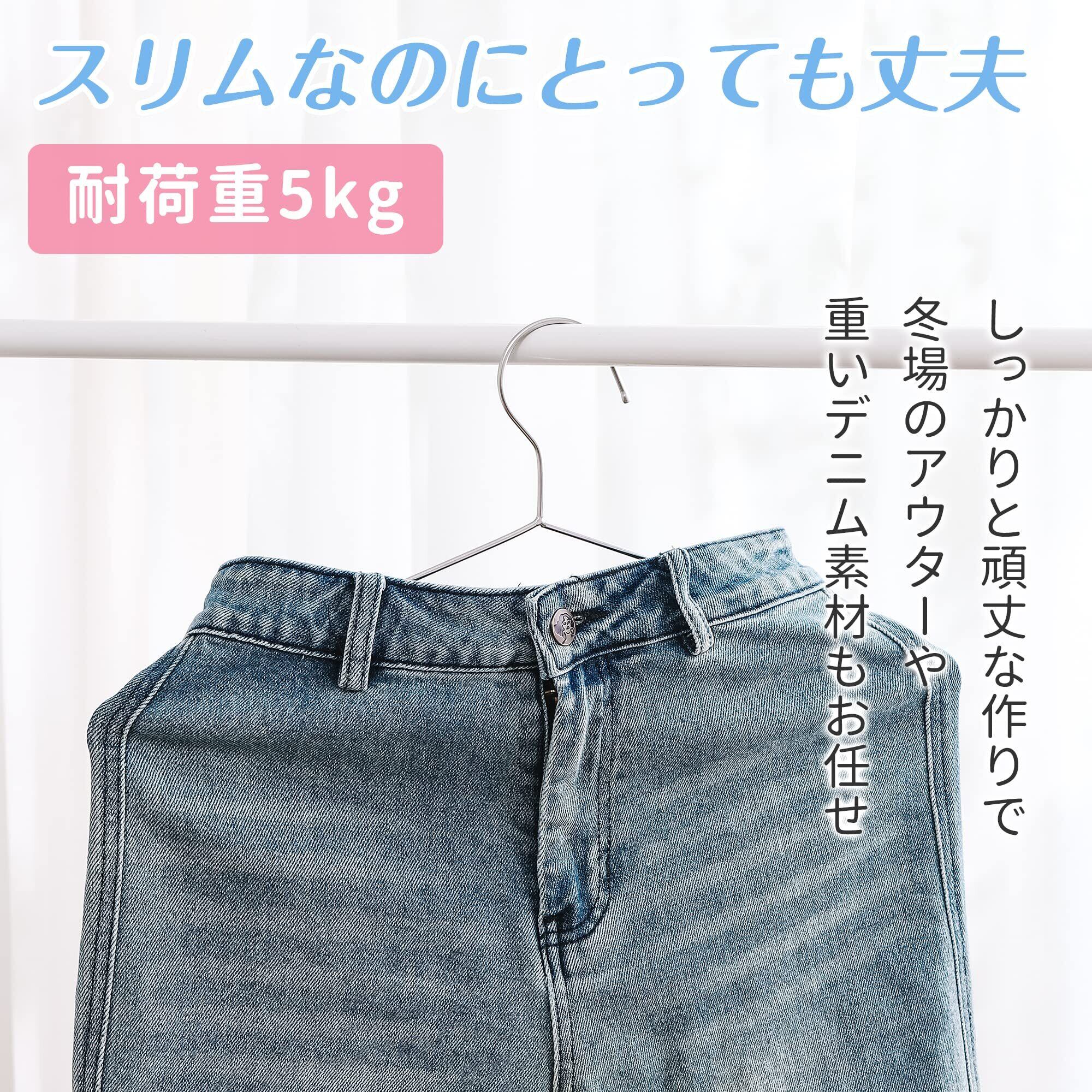 【ステンレスハンガー】高品質ステンレス採用、サビにくく耐久性に優れたステンレスハンガー。濡れた衣服をかけても、浴室乾燥でも、外での長時間の使用も全く問題ありません。
