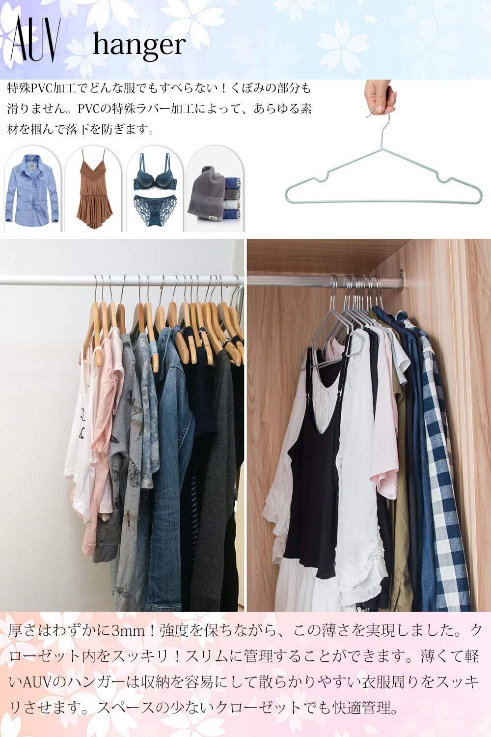 【すべらない】PVC材料が滑り止めの効果がよくて、どんな衣類を掛けても落ちる心配がありません。コート、洋服、キャミソール、スカート、タオル、またズボンにも対応できます。安心に使えるハンガーです。