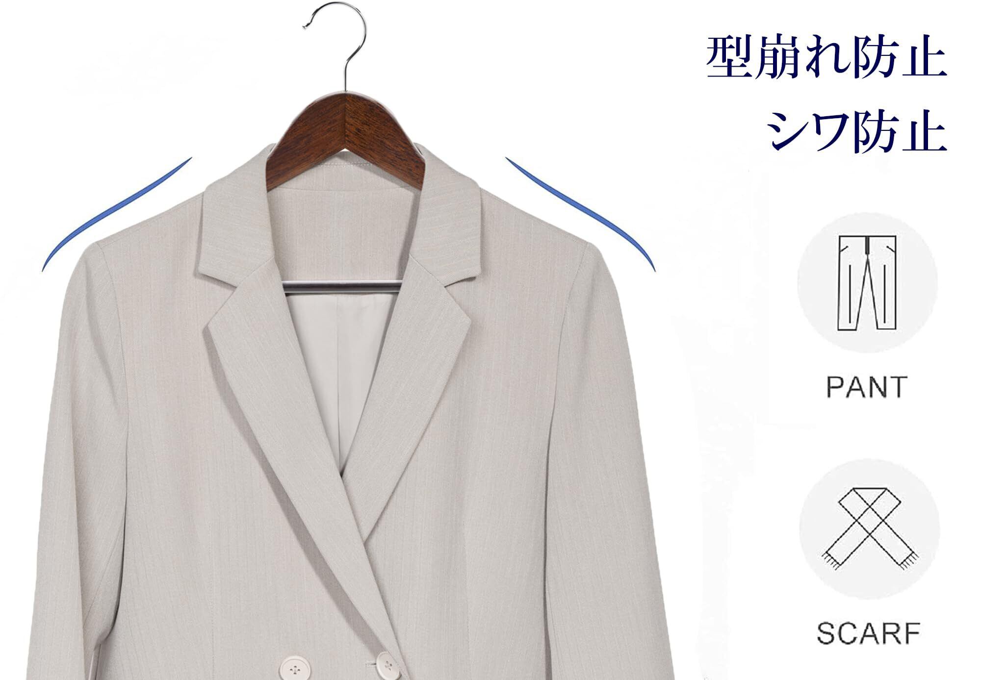 【人間工学に基づく】:肩幅と合っているサイズによりのデザインは衣類にハンガーの跡が残らず、型崩れしにくい、変形せずにお洋服をスッキリ保存します。