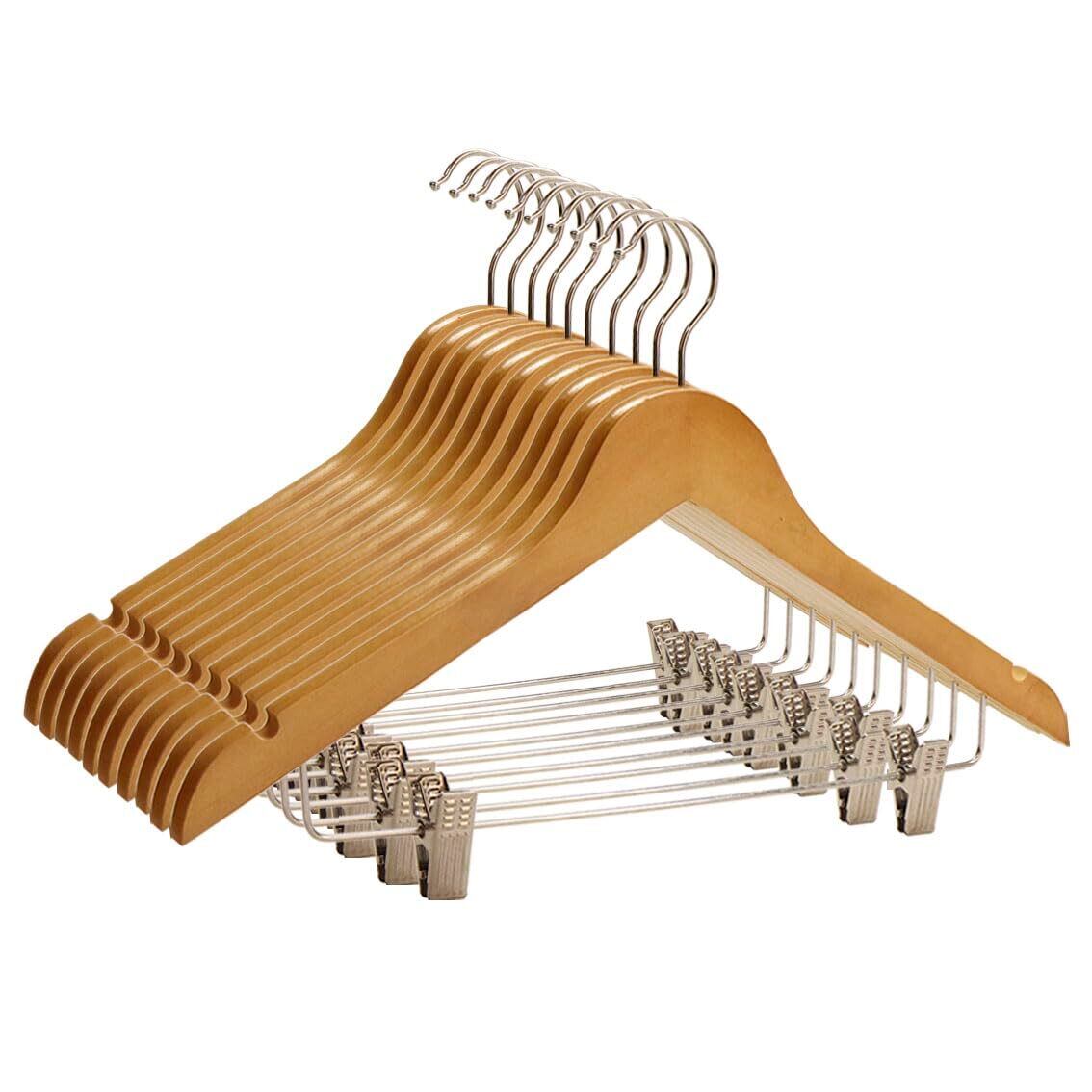 【在庫処分】太陽の魚 ハンガー 木製ハンガー 360度前にクリップ付きのメンズスーツハンガー、トレースストレージなし 10本セット (ナチュラル, 10)