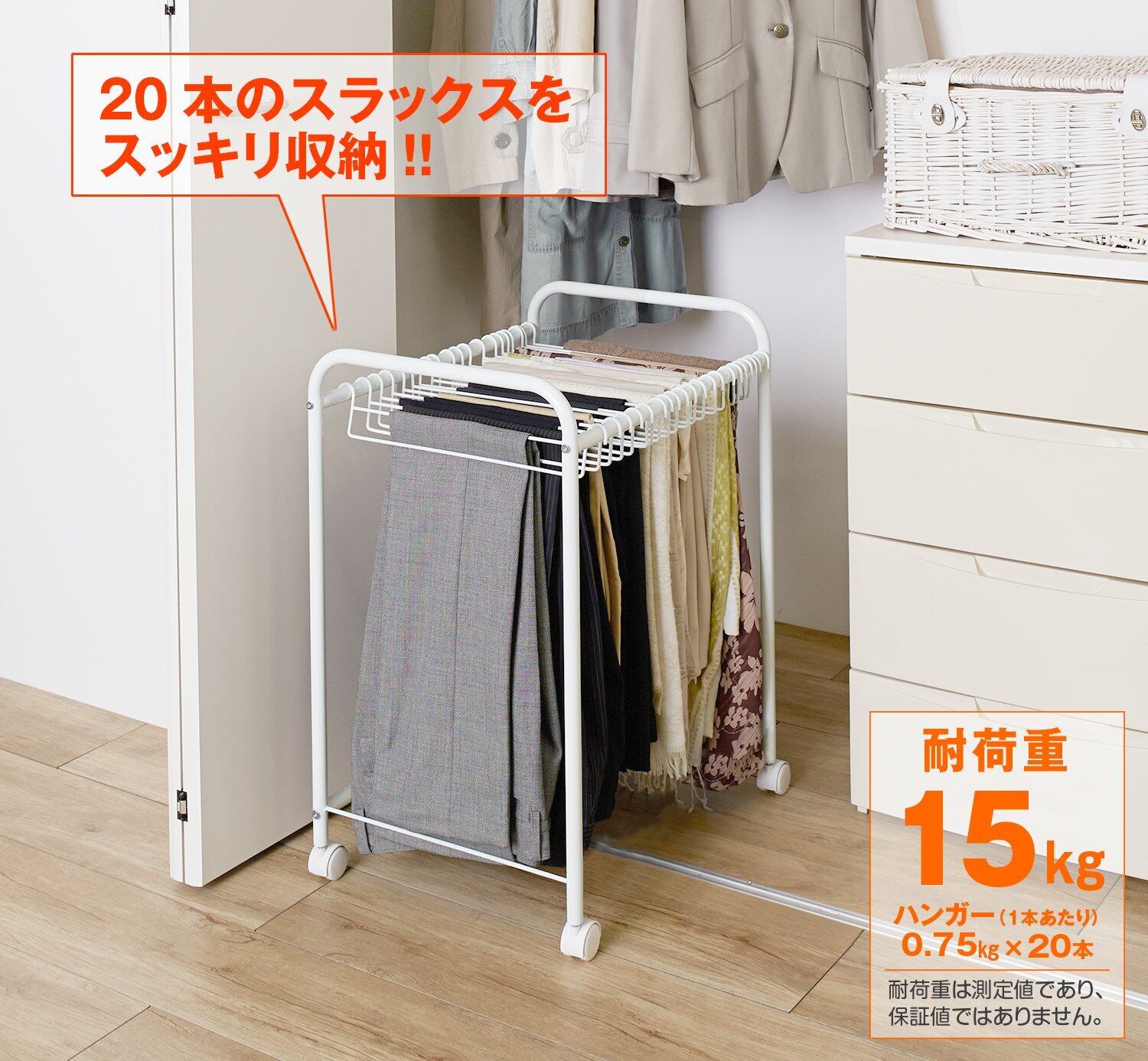 横幅43cmのコンパクトサイズで、最大20着までのズボンやスラックスを収納できる、便利なボトムスハンガー。