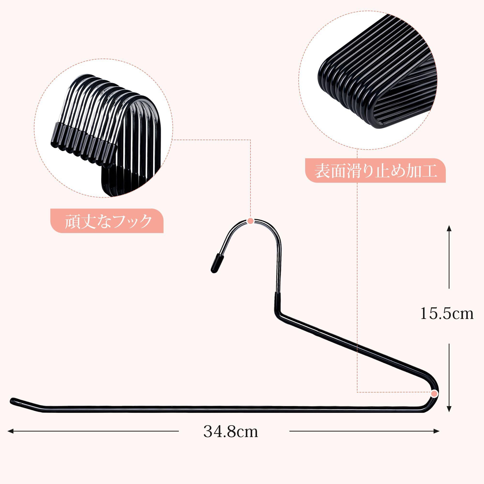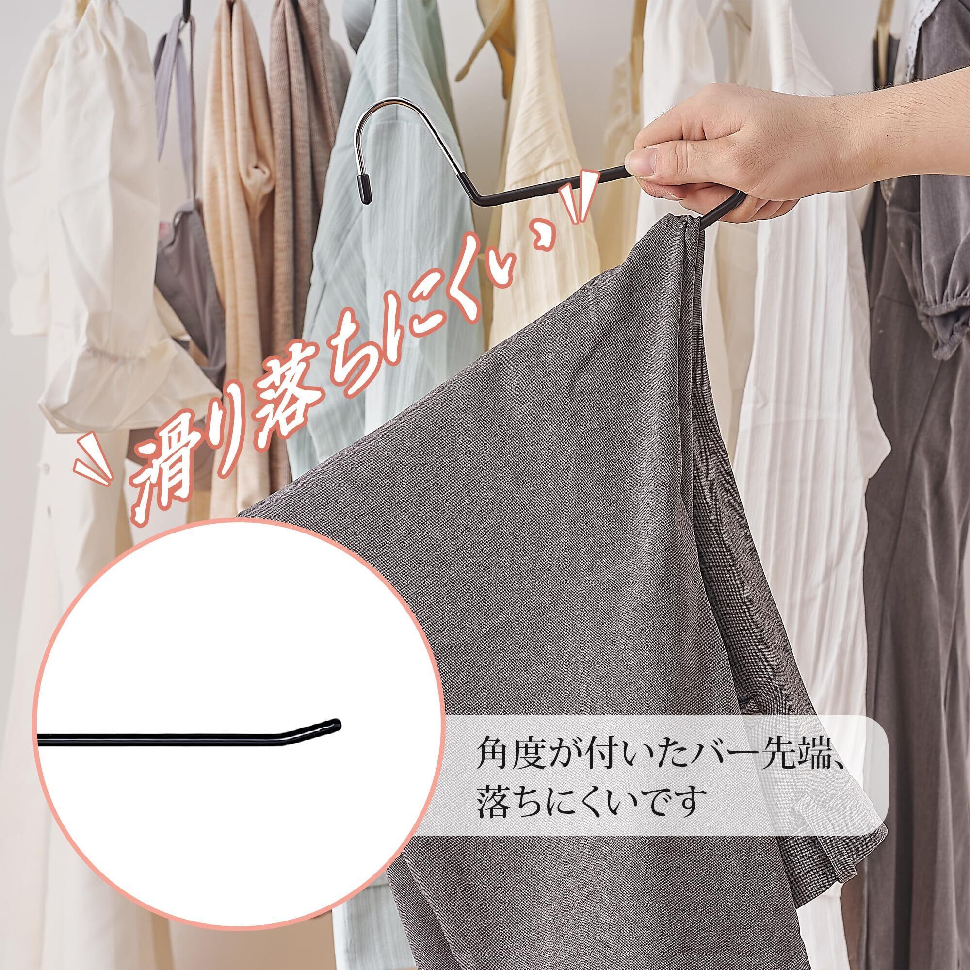 【滑らない】PVC特殊コーティングのプラスチック素材を使用しているため、滑りにくく、滑り落ちやすい衣類もしっかりと掛けられます。また、上向きのリアデザインにより、衣類のずれ落ちを防ぎます。さらに、フック部分にラバーキャップが付いているため、衣類や指が引っかかる心配がありません