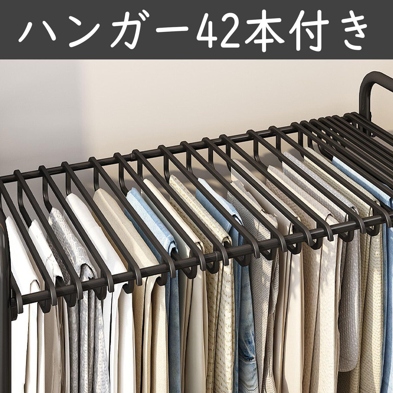 【2段式デザインで多用途収納】 ハンガー42本付き。上部はスラックスやパンツを収納可能。下部の横棒には靴やバッグ、小物を掛けて、1台で多様なアイテムを整理できます。