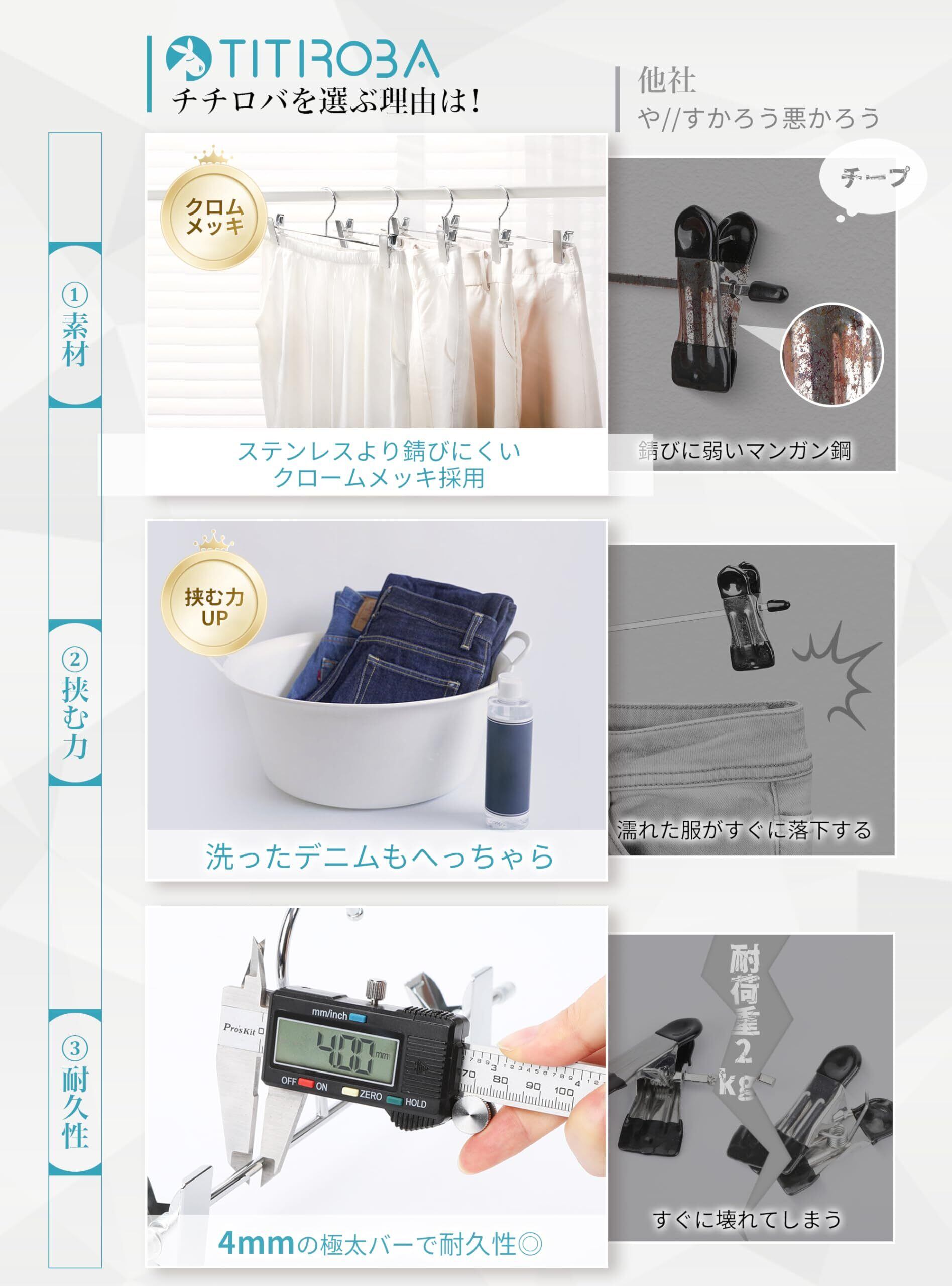 【強力クリップで重たい衣類も落ちない】クリップ部はチチロバの特殊コーティングがされているので、ずれ落ちを防止しながらも衣類を傷めません。