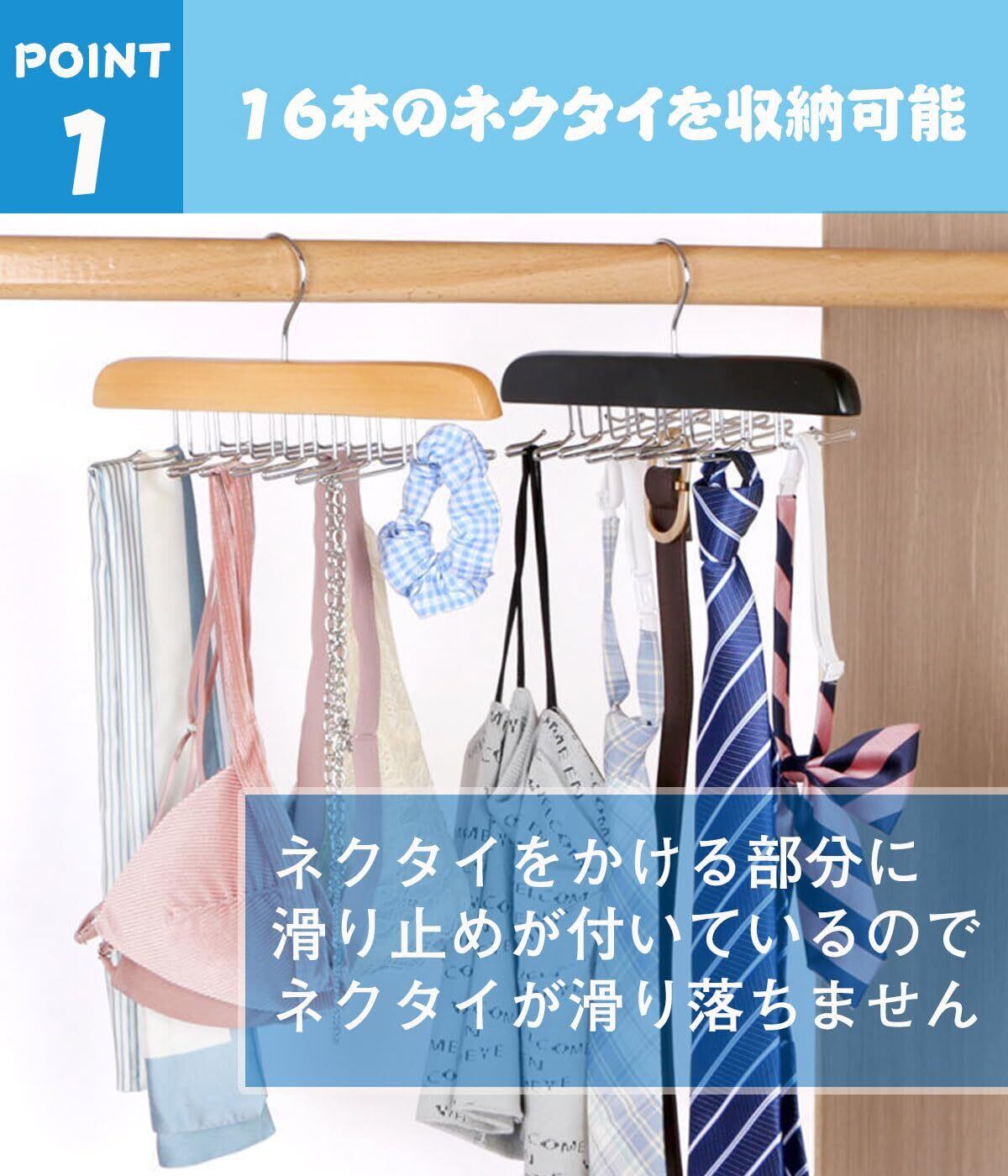 【高級製】滑らかな木材でネクタイの生地が引っかかりにくい、天然木をフレームに使用した高級感のあるアイテム。木材の表面が滑らかで、ネクタイの生地が引っかかりにくいのが特徴です。ネクタイのフックは錆びにくく耐久性に優れたクロム合金を採用しています。