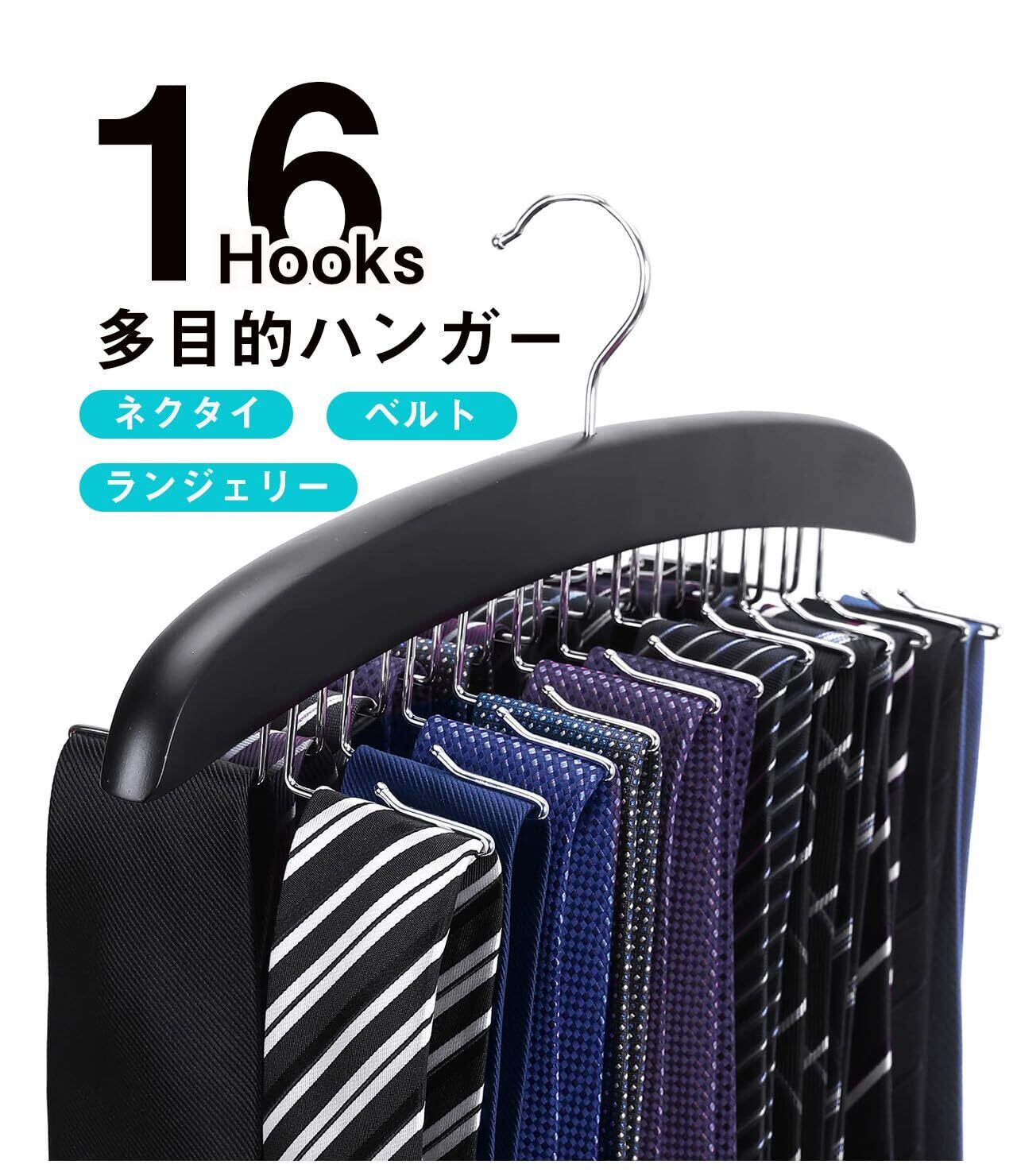 【16本掛け】16本掛けられるネクタイハンガーです。フックは折り畳み式で使用しない時はスッキリ収納可能!落下防止のフック付きで、ネクタイだけでなく ベルト、帽子、スカーフ、キャミソールなど様々なものも収納可能です。