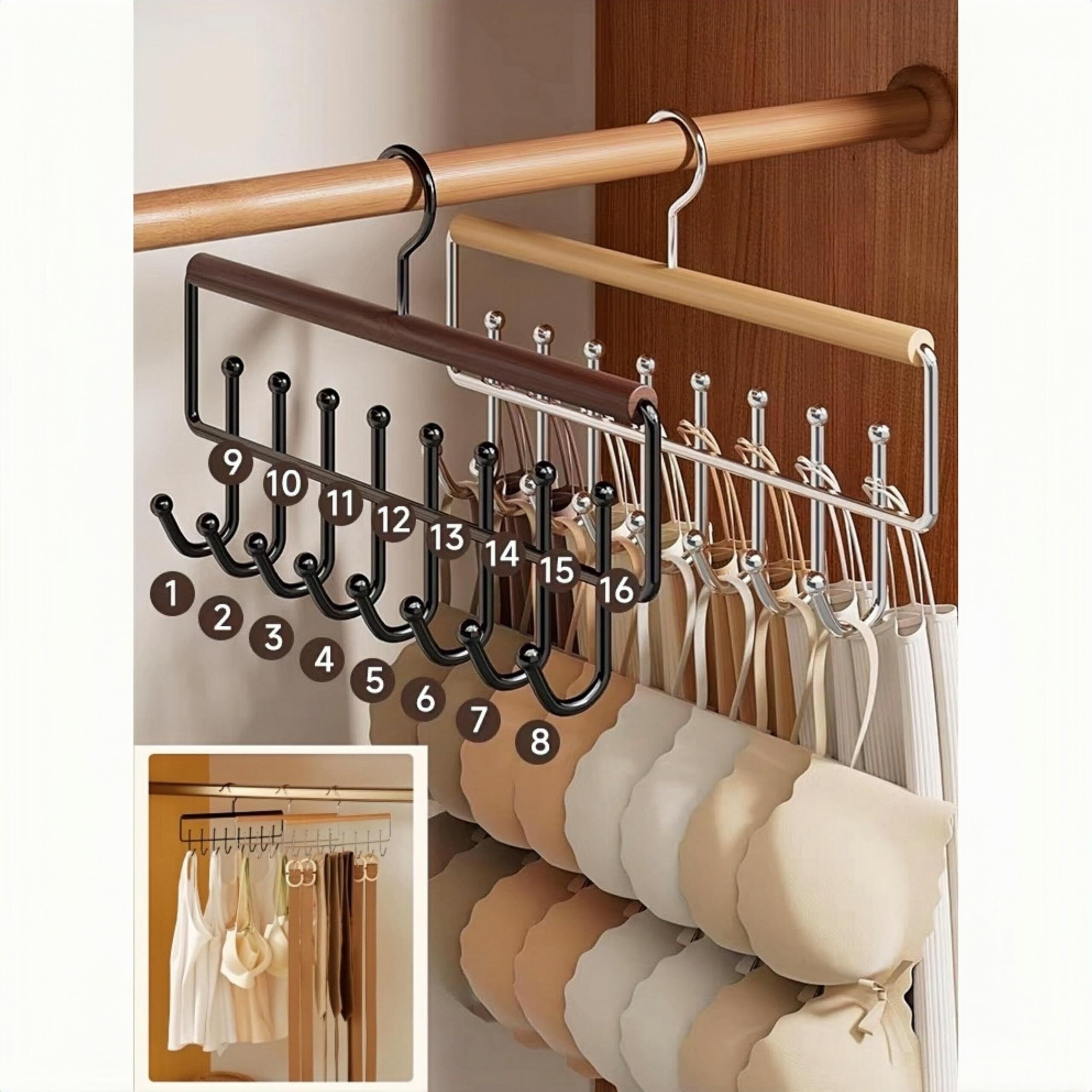 この「木紋+鉄骨 マルチフックハンガー」は、可折叠式のデザインで不用時はコンパクトに片付けられ、小さなスペースでも大活躍。8+8の計16個のフックを上下2段に配置し、下着から小物まで幅広いアイテムを効率的に収納できます。