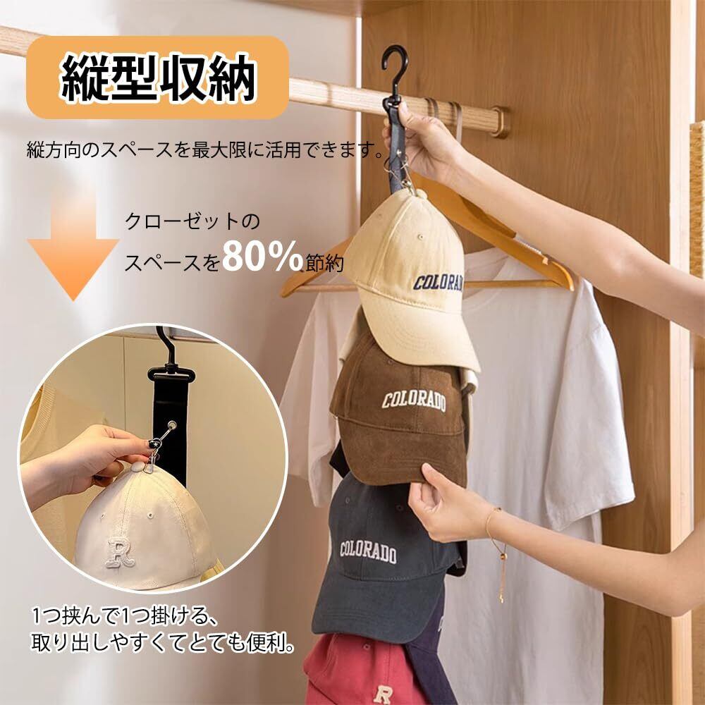 2.【省スペースでスッキリ収納】縦長デザインにより、最大8個の帽子を縦に吊るして収納可能。クローゼットや壁面の空間を有効活用でき、帽子を重ねず型崩れも防止。収納効率を高めたい方に最適です。