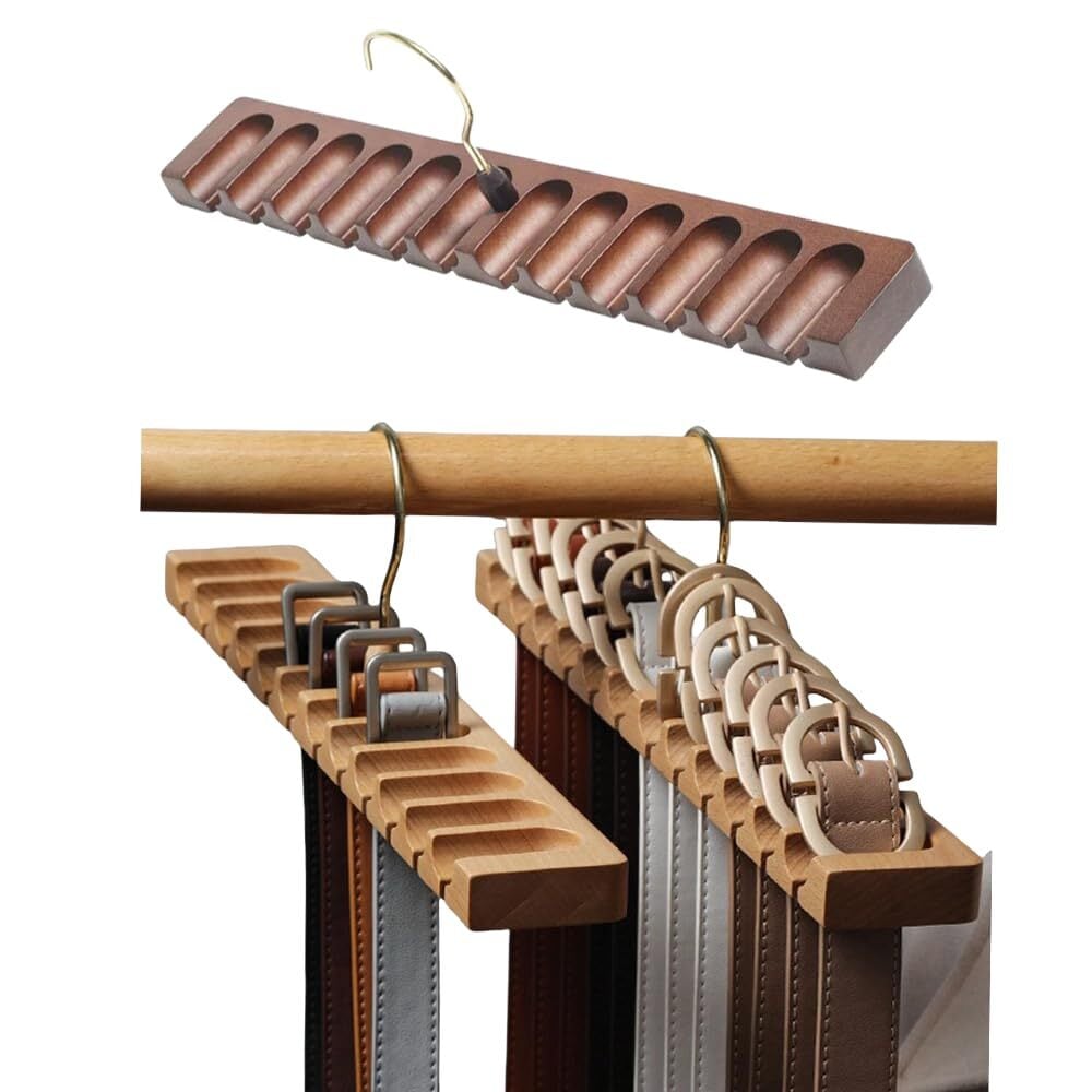 【商品の仕様】サイズ:39×5.5×2cm このベルトハンガーは、上質な天然ブナ材で制作され、丁寧に加工されているため、高級感と優れた耐久性を兼ね備えています。1.7cmのスロット設計により、簡単に取り付け・取り外しが可能。さらに、360度回転するサビにくい金属製フックを採用しているため、アクセサリーを自由に掛けられ、使い勝手が抜群です。